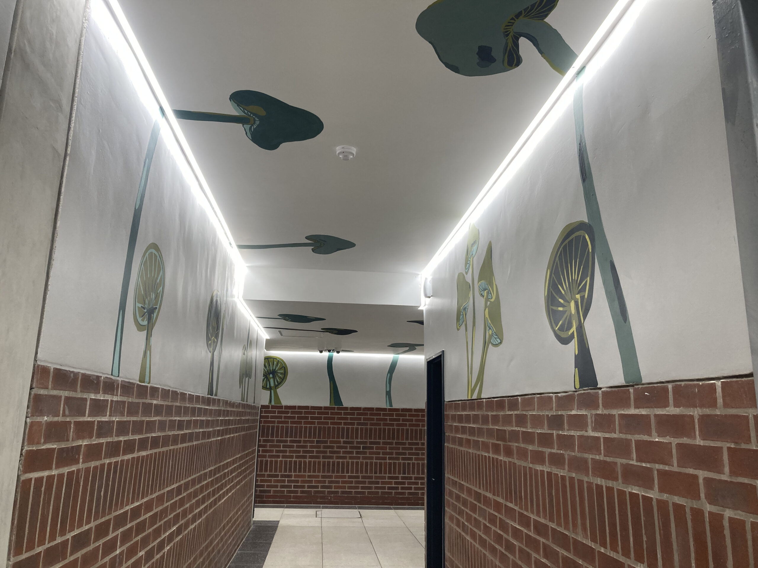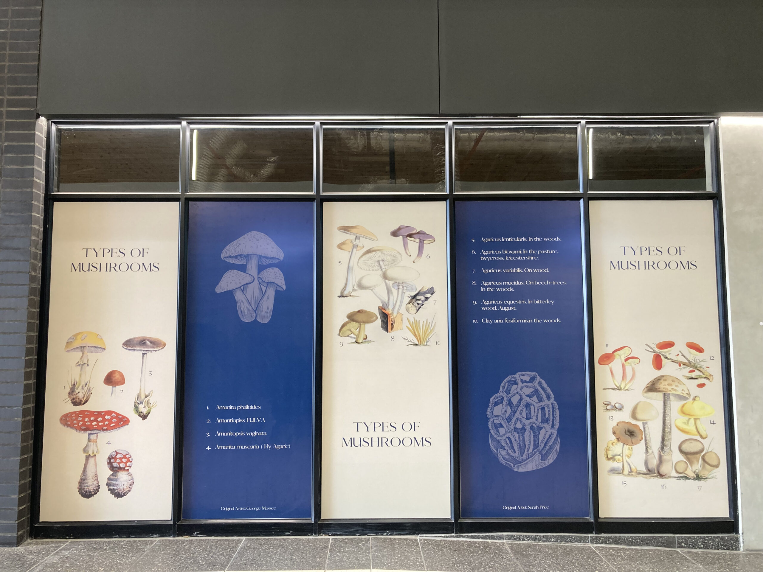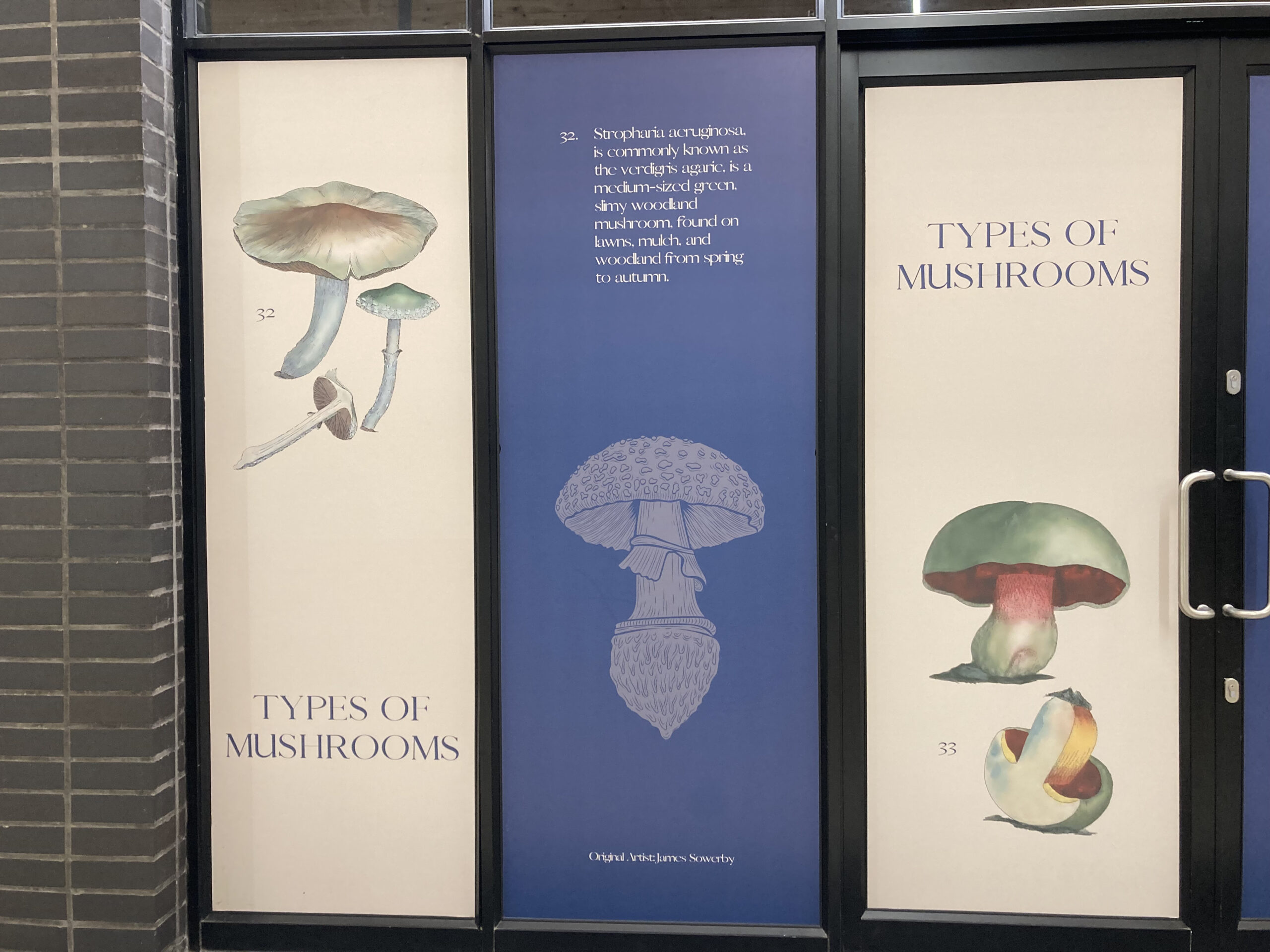 中に入るとキノコの壁紙、キノコの説明の書かれたドア、キノコのオブジェの数々が目に飛び込んできます。