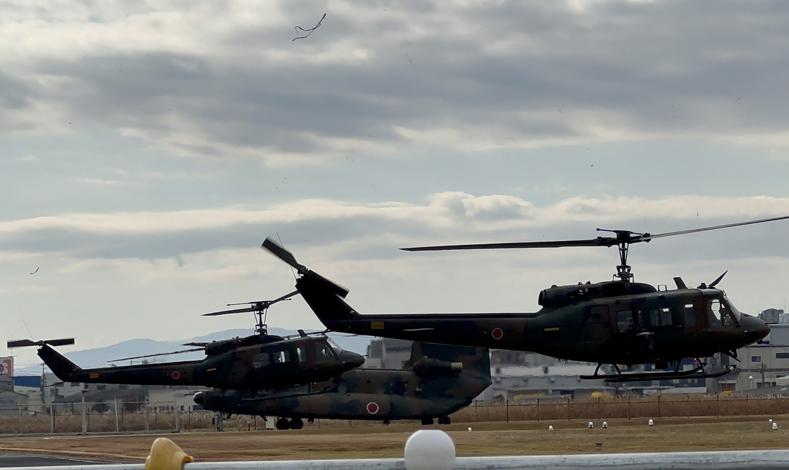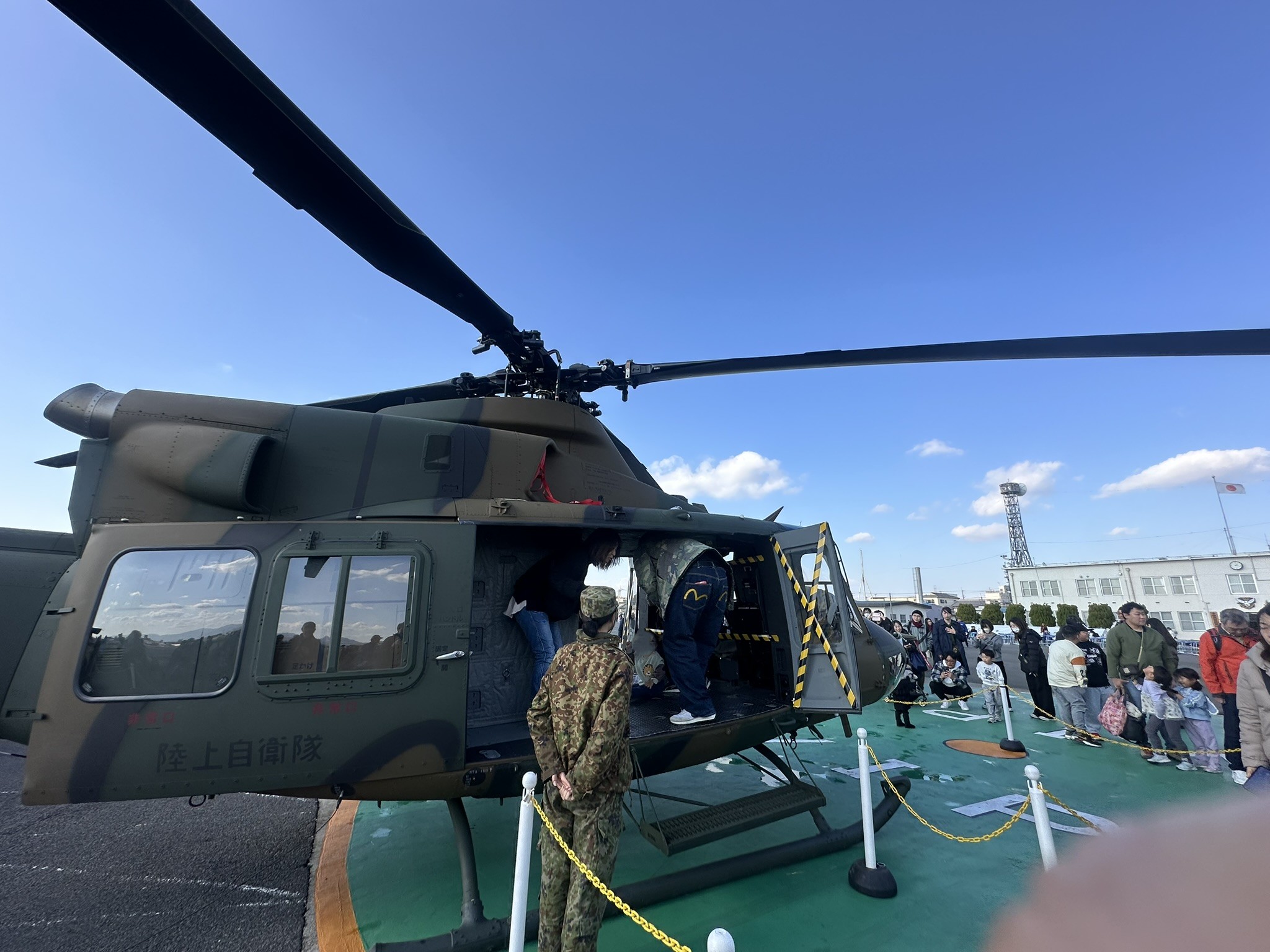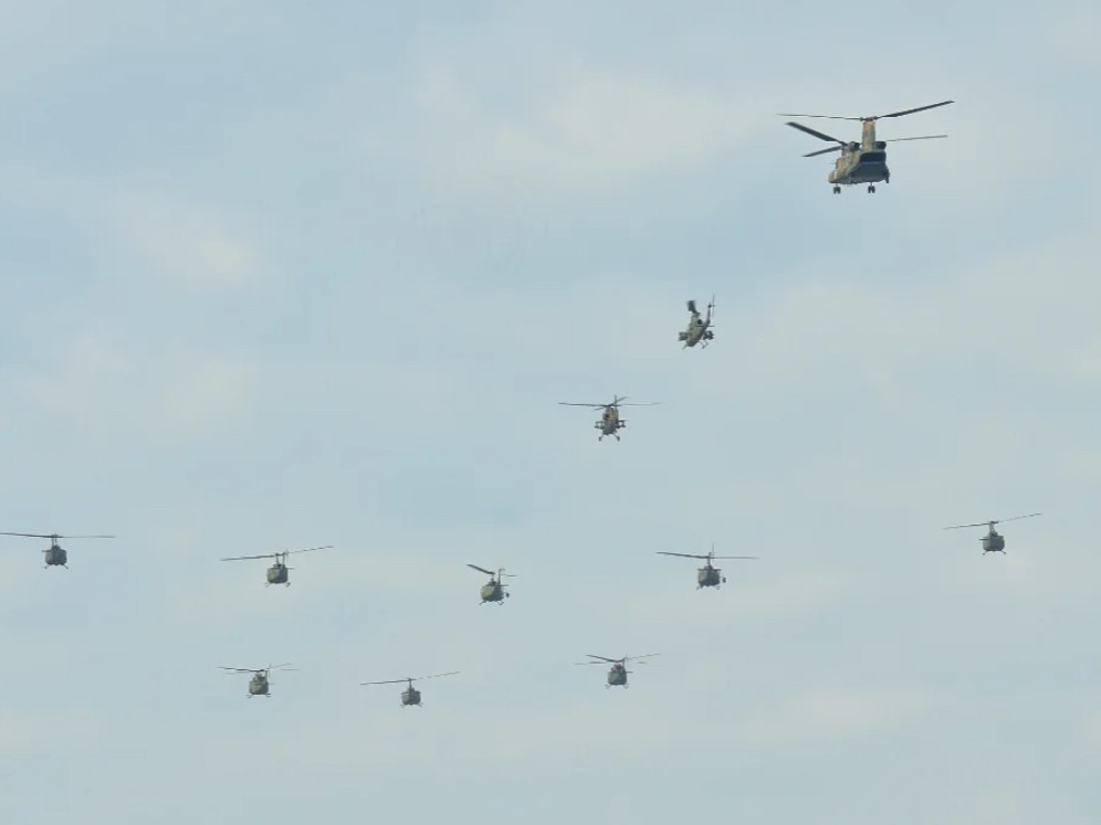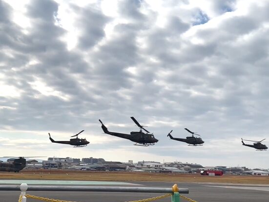 観閲飛行では、UH-2、UH-1J、OH-1、AH-1S、CH-47など、11機のヘリコプターが編隊を組み、一斉に離陸。轟音とともに空へ舞い上がる姿に、来場者の視線が一斉に空へ向けられました。