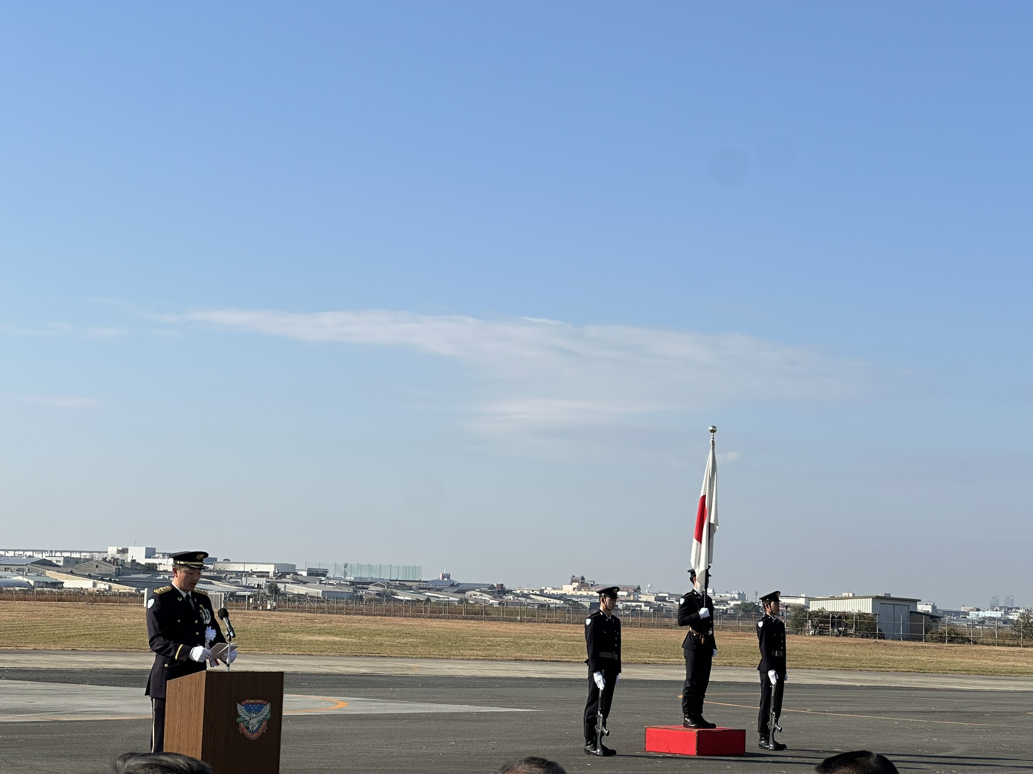 続いて国旗入場、開会宣言、祝辞、第3音楽隊による演奏と国歌斉唱が行われ、厳粛な雰囲気の中で式典が進行しました。