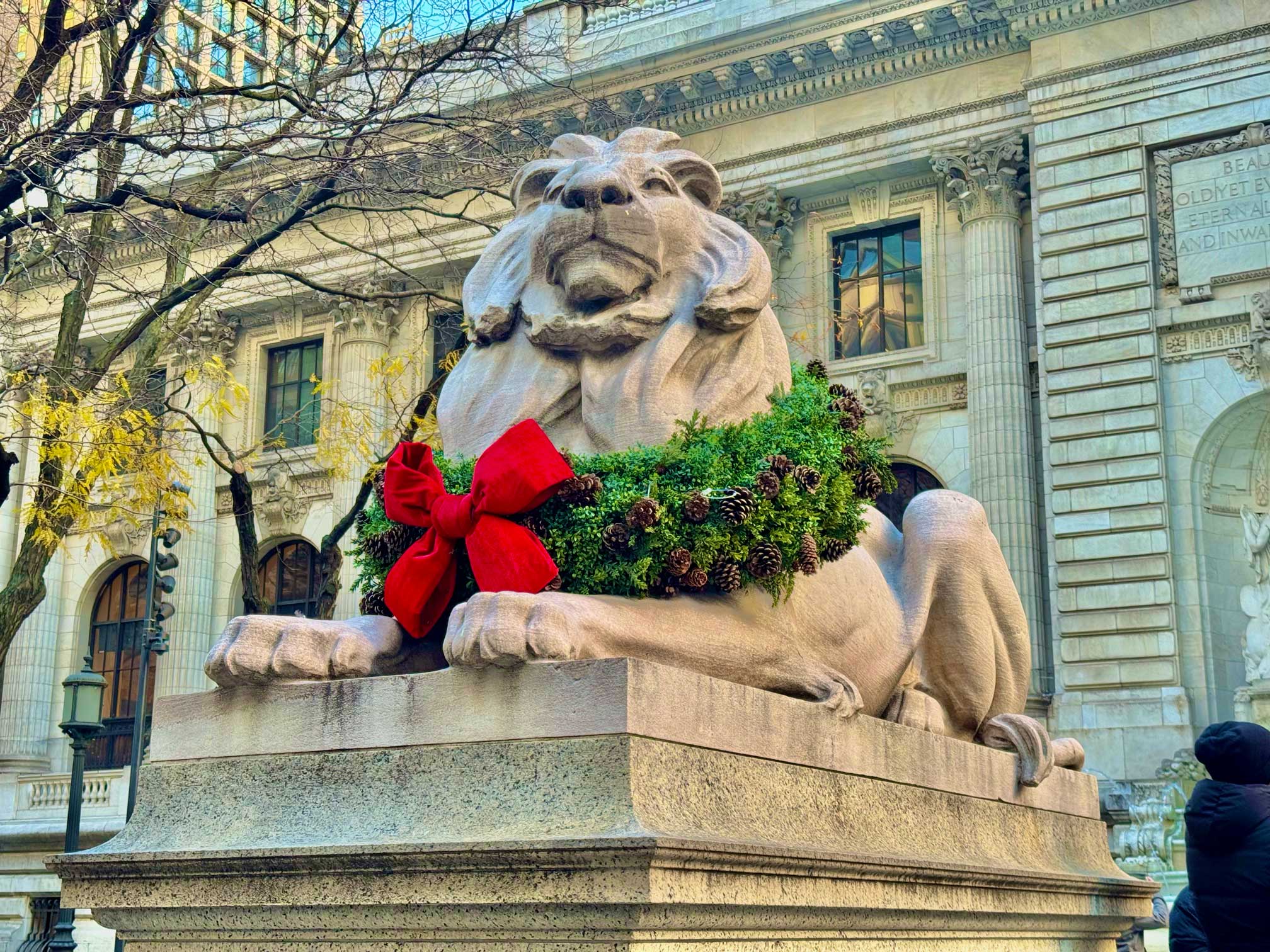 公園のすぐ隣には、ニューヨーク公共図書館(New York Public Library)があります。この時期、図書館の入り口前にいるライオン像の首にはクリスマスリースがかけられており、写真映えするので合わせて訪れてみてはいかがでしょうか。