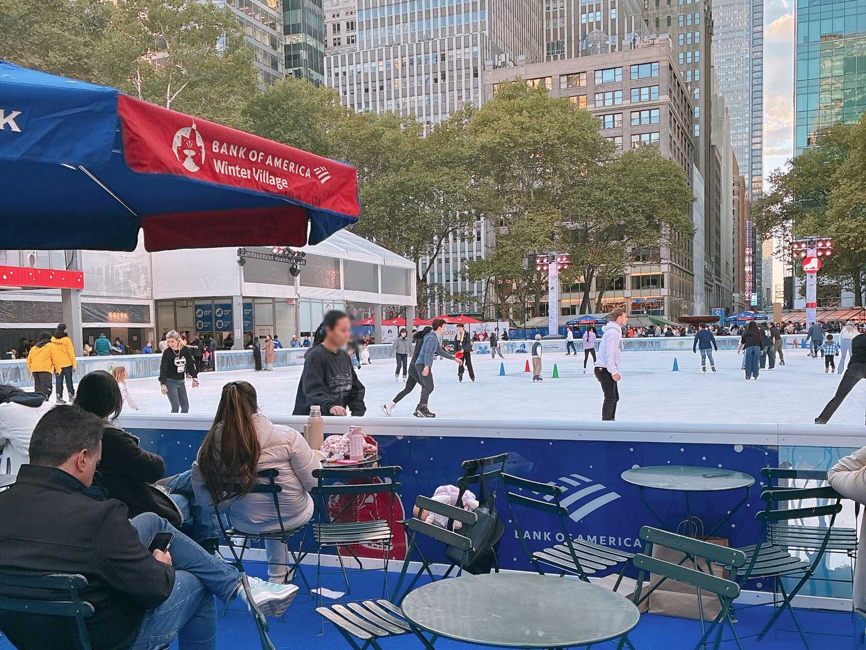 公園内には、特設のスケートリンクがあります。クリスマスシーズンのスケートリンクといえばロックフェラーセンターが有名ですが、ブライアントパークのスケートリンクも大人気で、平日も老若男女問わずスケートを楽しんでいる姿がみられます。