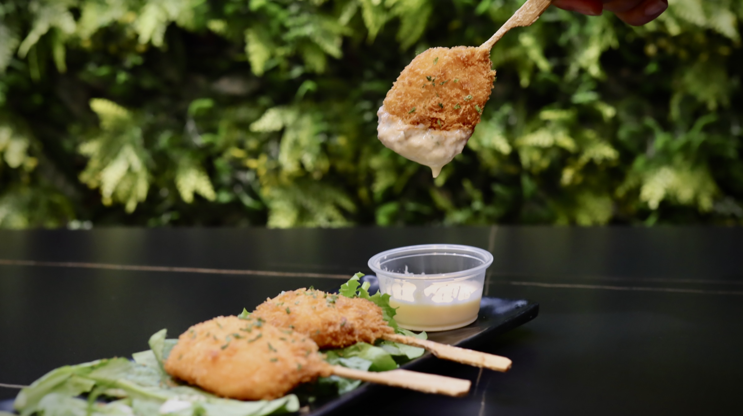 居酒屋メニューの冬の限定メニューは「海老ロリポップ」です。ロリポップのように串刺しにした海老のすり身をカリッと揚げて、自家製ココナッツ・パイナップル・マヨネーズで食べます。トロピカルなアクセントが効いていて、ビールと一緒にラーメンの前に食べたい一品です。