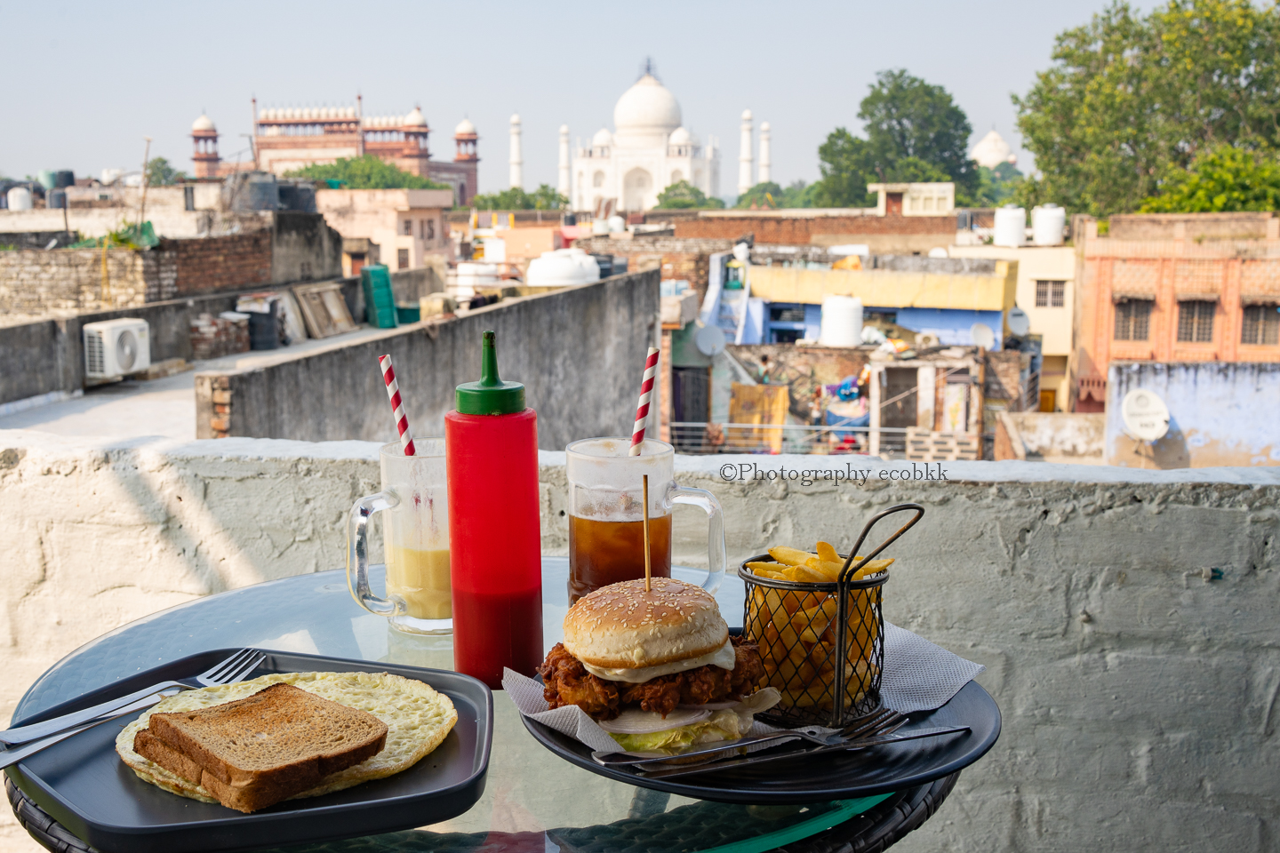 今回、注文したのは、冷たいアメリカーノとマンゴーのドリンク、チキンバーガーとチーズオムレツの4種類です。アメリカーノは甘くなく、すっきりとした味わいで、飲みやすかったです。マンゴーのドリンクはマンゴーの季節ではないこともあるのか、思っていたような味わいではなかったようです。以前、デリーのカフェでハンバーガーを食べた時にとても残念だったので、全く期待していなかったのですが、こちらのチキンバーガーはおいしいチキンカツと癖のないソースが使われていて、とてもおいしく感じました。チーズオムレツは、日本人が思い描くようなオムレツの形状ではなくて、食パンと薄焼き卵がついてくる感じでした。チーズ感はほとんどありませんでした。タージ・マハルを観賞できるスポットは外国人入場料が600ルピー以上する感じなので、ここは、同じぐらいの値段でランチをしながら、タージ・マハルを眺められるので、外国人にとってはお得感があるなぁと感じました。