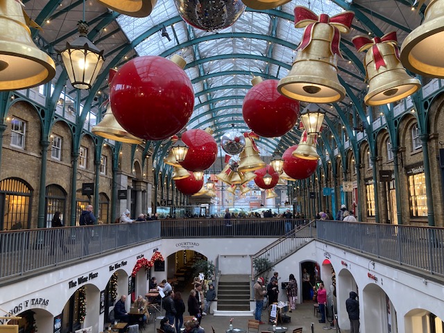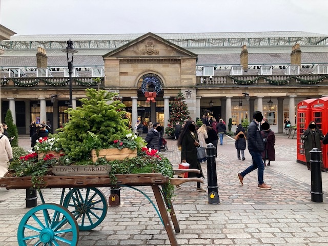 ロンドン観光名所のひとつ、コヴェントガーデン。年間を通していつも観光客で賑わいますが、クリスマスからニューイヤーの時期はまた格別です。