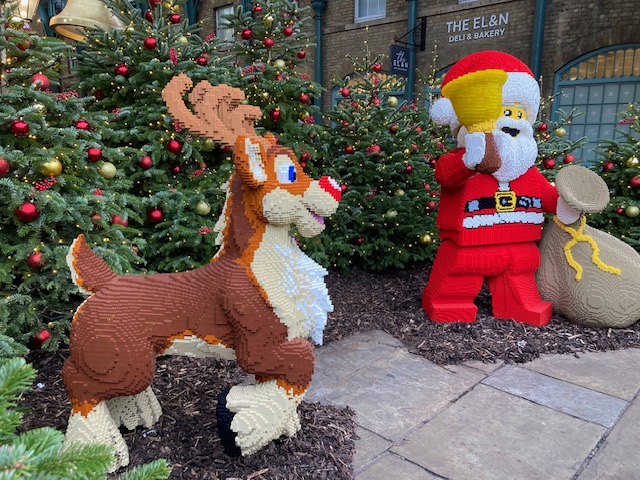 またアップルマーケット入口近くでは、ほぼ実物大(?)に作られたレゴのサンタクロースとトナカイが人気。彼らをバックにして写真を撮る人たちが並び、ちょっとした行列になっています。