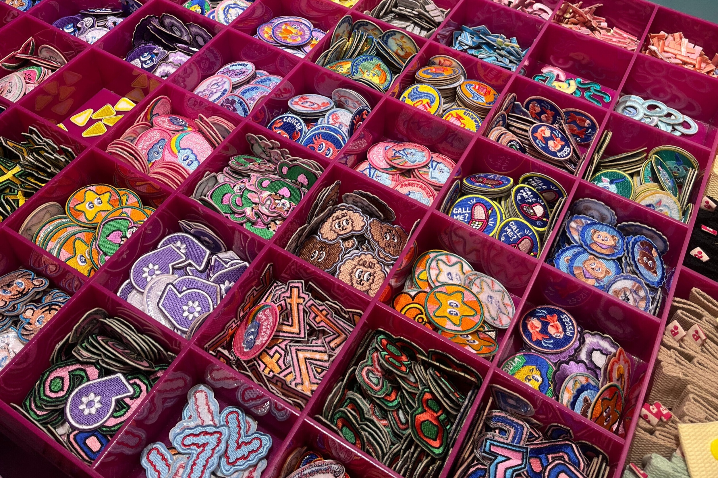 ずらりと並ぶ刺繍ワッペンの中からお気に入りのワッペンを見つけてトレーに置きながら、デザインを考えます。ワッペンは大きさやデザインで値段が異なります。アルファベットや数字以外にも、動物や星などのキャラクター、花などさまざまなモチーフのワッペンがあります。同じアルファベットや数字でもいくつかデザインが異なっていたので、自分好みのデザインを選ぶことができます。