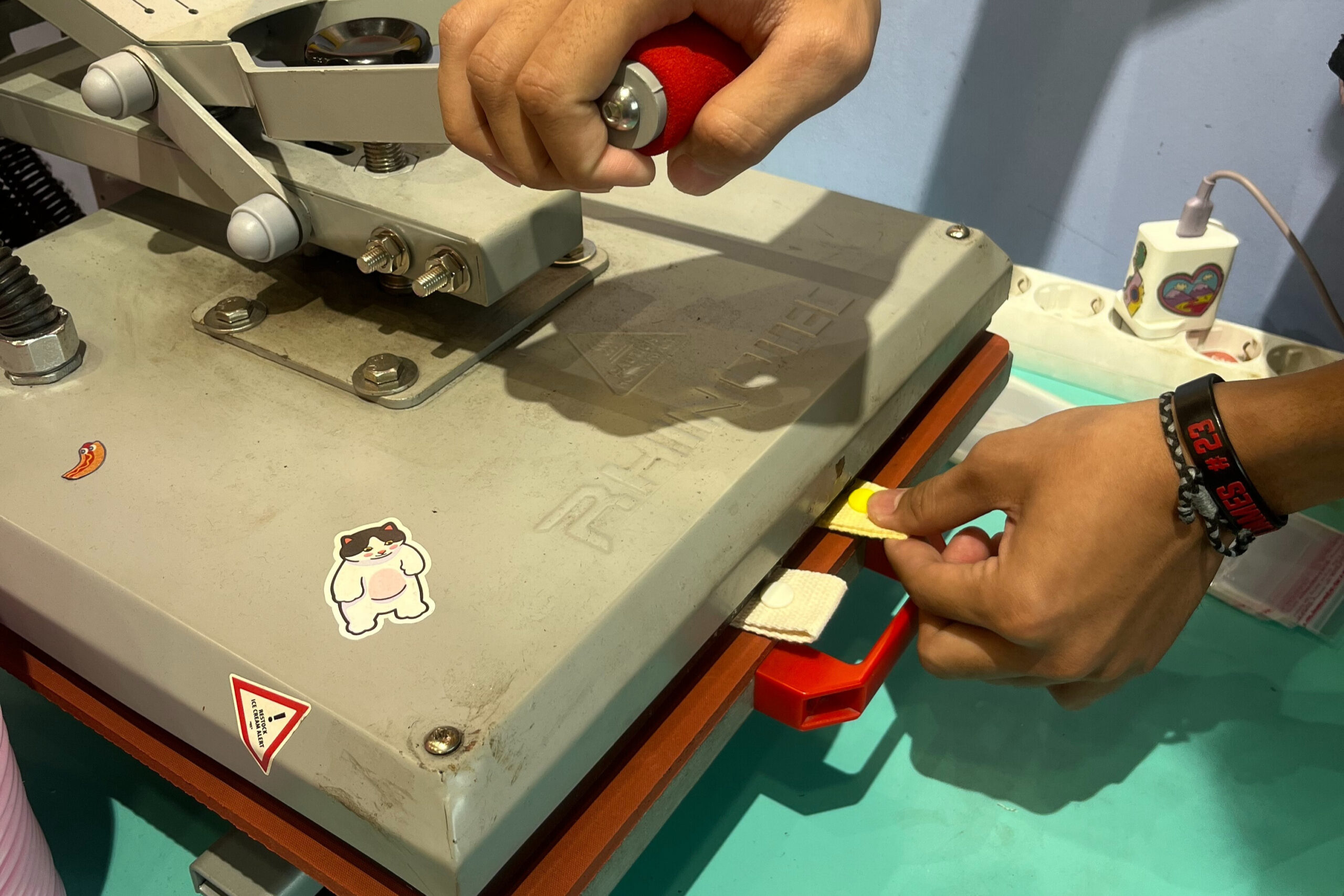 フロアで待機しているスタッフさんのところへ持っていくと、位置を確認してくれるので調整して高温プレスしてもらいます。完成したグッズを最後にレジへ持っていくと、購入完了です。旅の記念に作成してみても楽しいかもしれません。