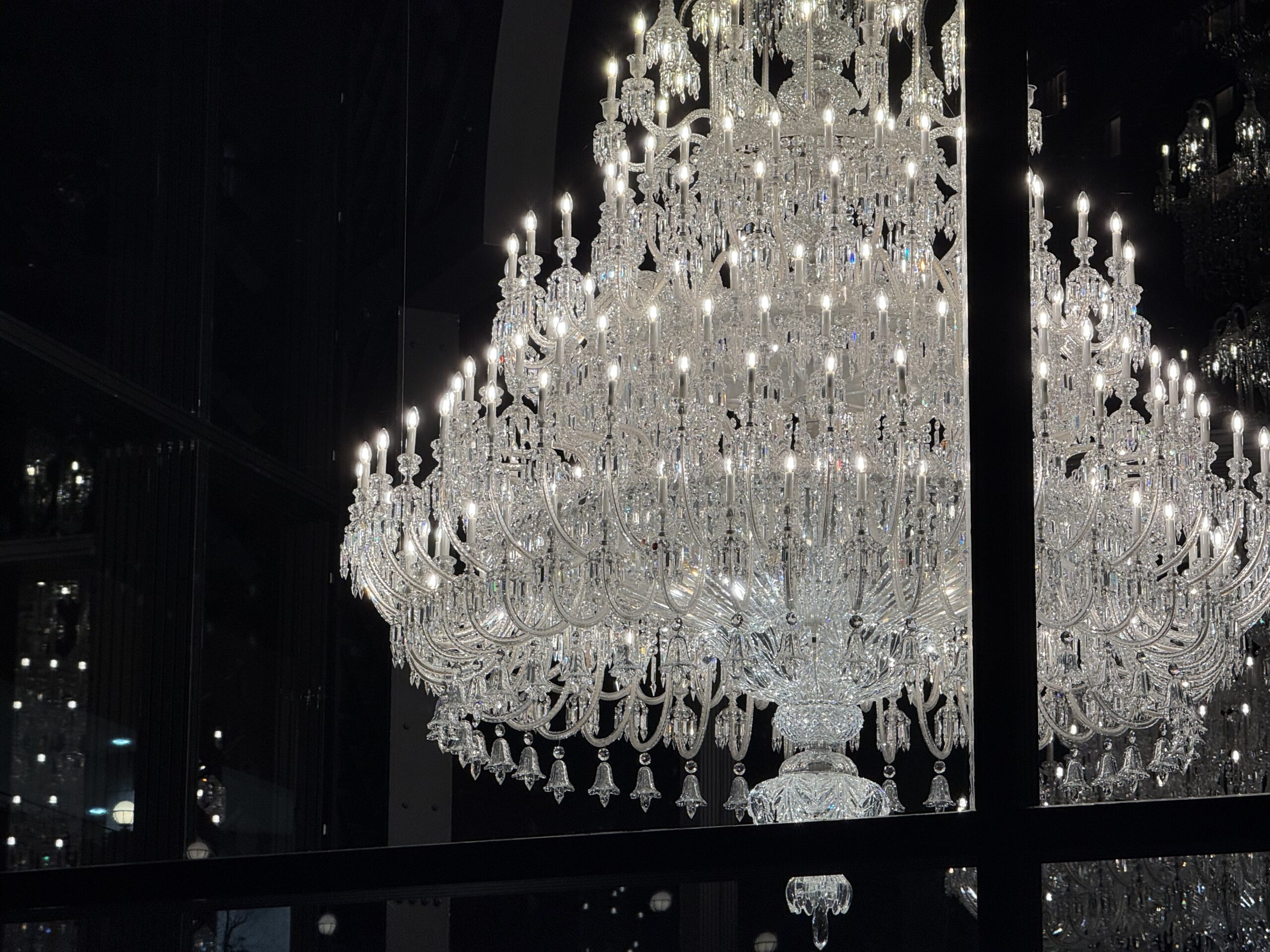高さ約5mの壮麗なバカラのシャンデリア。クリスタルパーツは、総数8,500ピースで煌びやかな輝きを放っています。