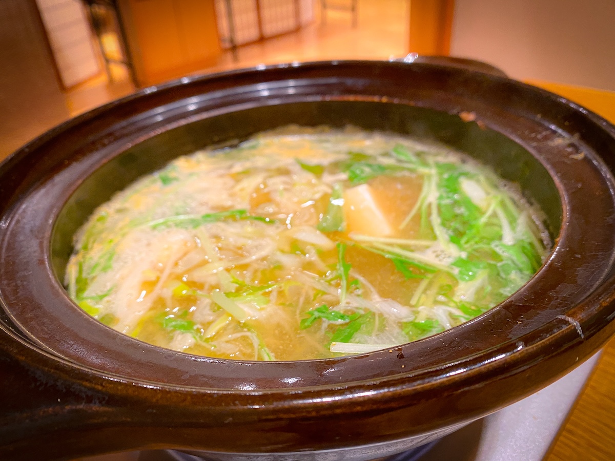 こちらは伊勢エビのお出汁でとった贅沢なお鍋。野菜をさっと湯がいていただくのですが、ゴクリっと喉を通るたびにいい香りが立ち込めます。最後は白米を混ぜて、雑炊にしていただくのがおすすめです。