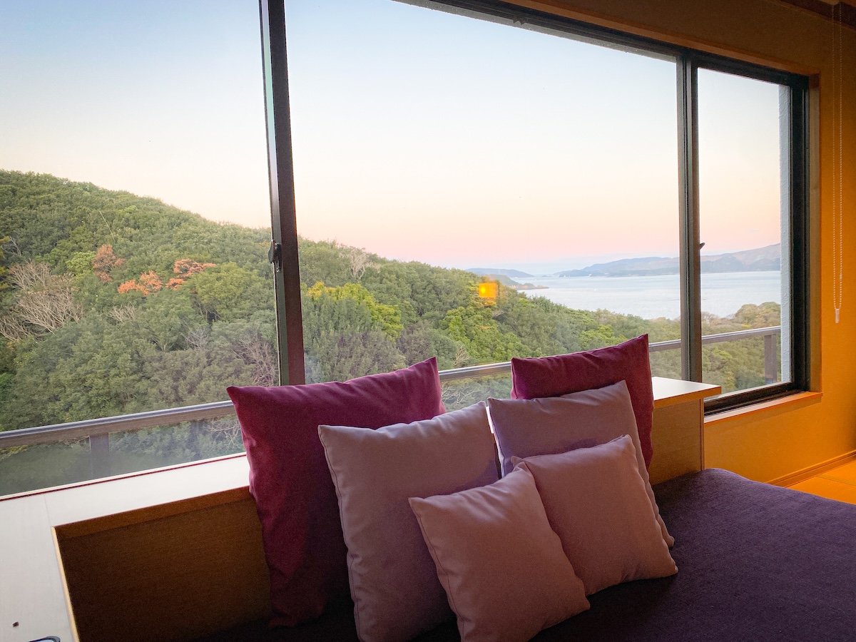 お部屋からは伊勢志摩の海が見えて絶景。この写真は、夕暮れどきの色彩の変化が楽しめます。