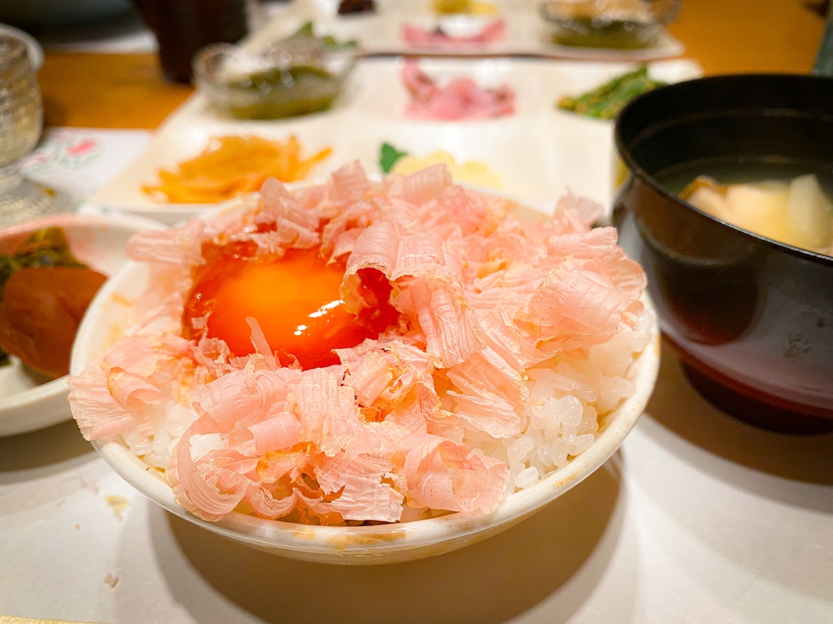 朝食でいただけるのは、ふわりと香る削り節に、卵を落とした漁師飯!シンプルだからこそ、素材の味わいが生きる一杯です。