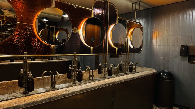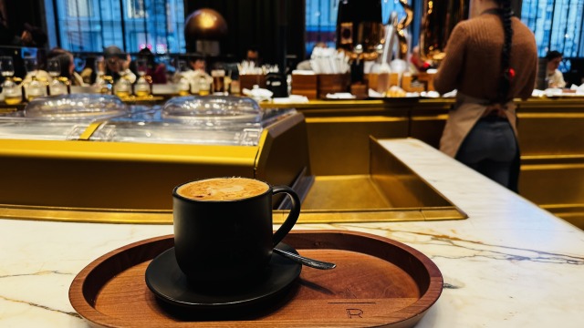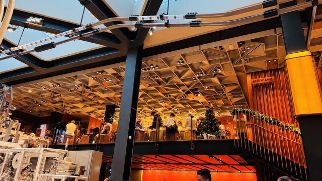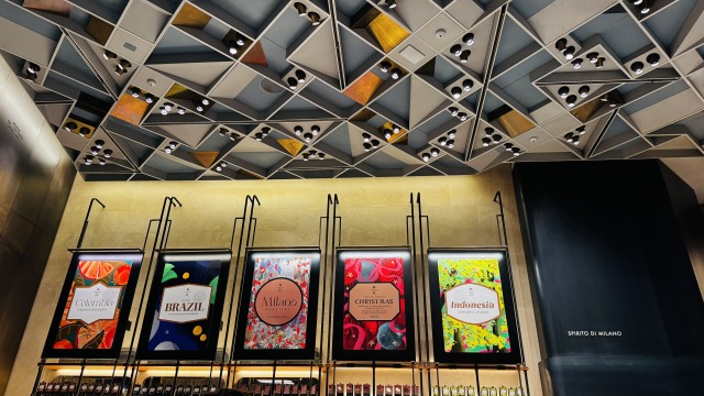 セキュリティがいるエントランスをくぐり、店内に足を踏み入れると、そこは吹き抜けの高い天井で圧倒的な開放感!カウンターやバーの天板には、トスカーナ産の大理石を、床には北イタリア伝統のモザイク様式の大理石タイルが職人によって敷き詰められています。店内中央には、大きな焙煎機が圧倒的な存在感を放っています。透明なパイプや真鍮のディテールが配され、ロースティングの工程そのものがデザインの一部になっています。コーヒーの仕込み風景を見せる構造となって、思わず見入ってしまうほど。天井の金属パネルから差し込む陽光や影が美しく交差する、計算され尽くした建築の美しさにもうっとり。歴史的な郵便局だった建物の重厚な骨格と、ミラノらしい洗練されたデザイン美が見事に融合しています。