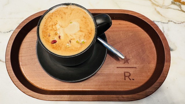 ミラノ店でしか飲めないものといえば、ピスタキオプラリネオーツラテ。ロースタリー専用のマイクロブレンドエスプレッソとオートミルクを使い、ピスタチオのクリームとプラリネで仕上げたラテ。甘さとナッツ感、ミルキーさが調和したおいしさです。