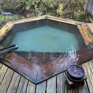 そしてこちらが貸し切り露天風呂の木のお風呂です。鍵がかけられるので独泉できます。