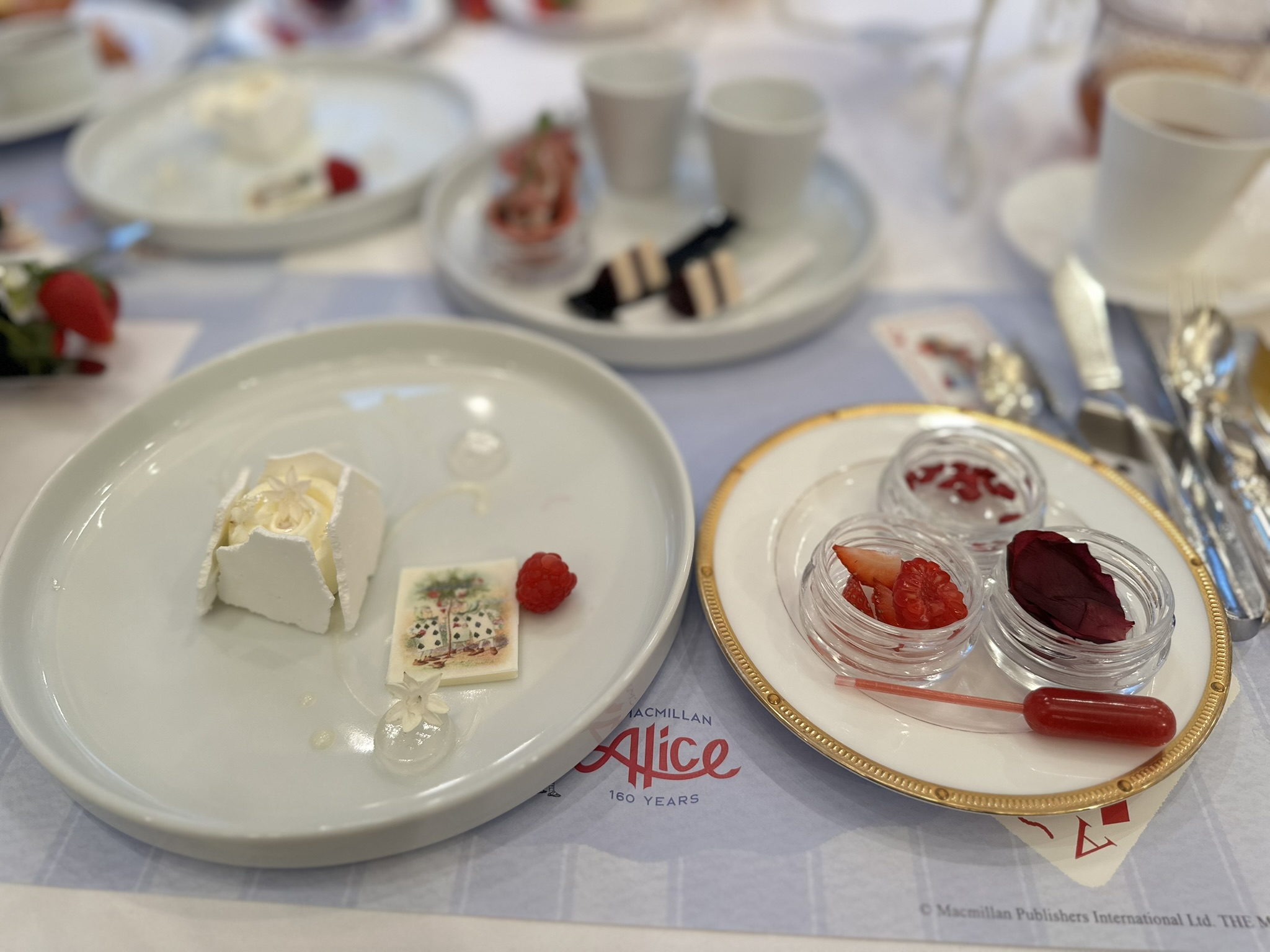 白い薔薇のムースにいちごソースを自分でかける、アリスのワンシーンを再現したオプションデザート。見た目だけでなく甘さと酸味のバランスも絶妙。