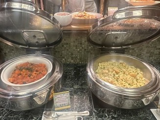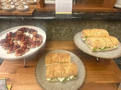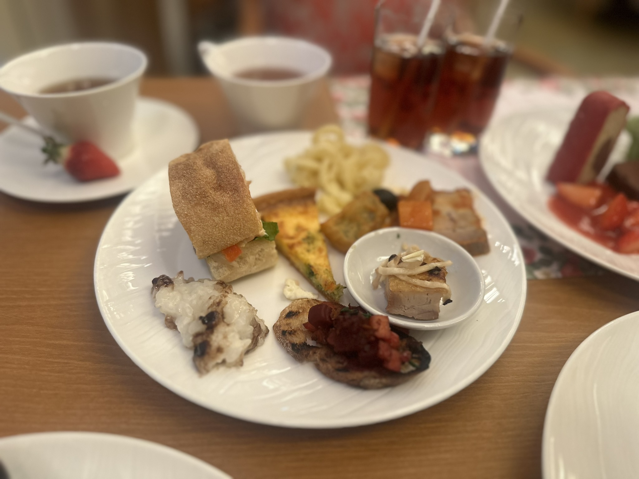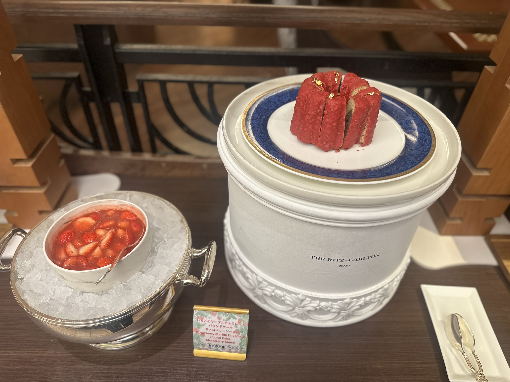 ブッフェのホールケーキは重たく感じられることも多い中、今回は印象が一変。スポンジは軽やかで口どけが良く、クリームやチョコレートとのバランスも秀逸です。パウンドケーキは仕上げにストロベリーソースをかけて自分好みに完成させる楽しさもあり、最後まで心地よく味わえました。