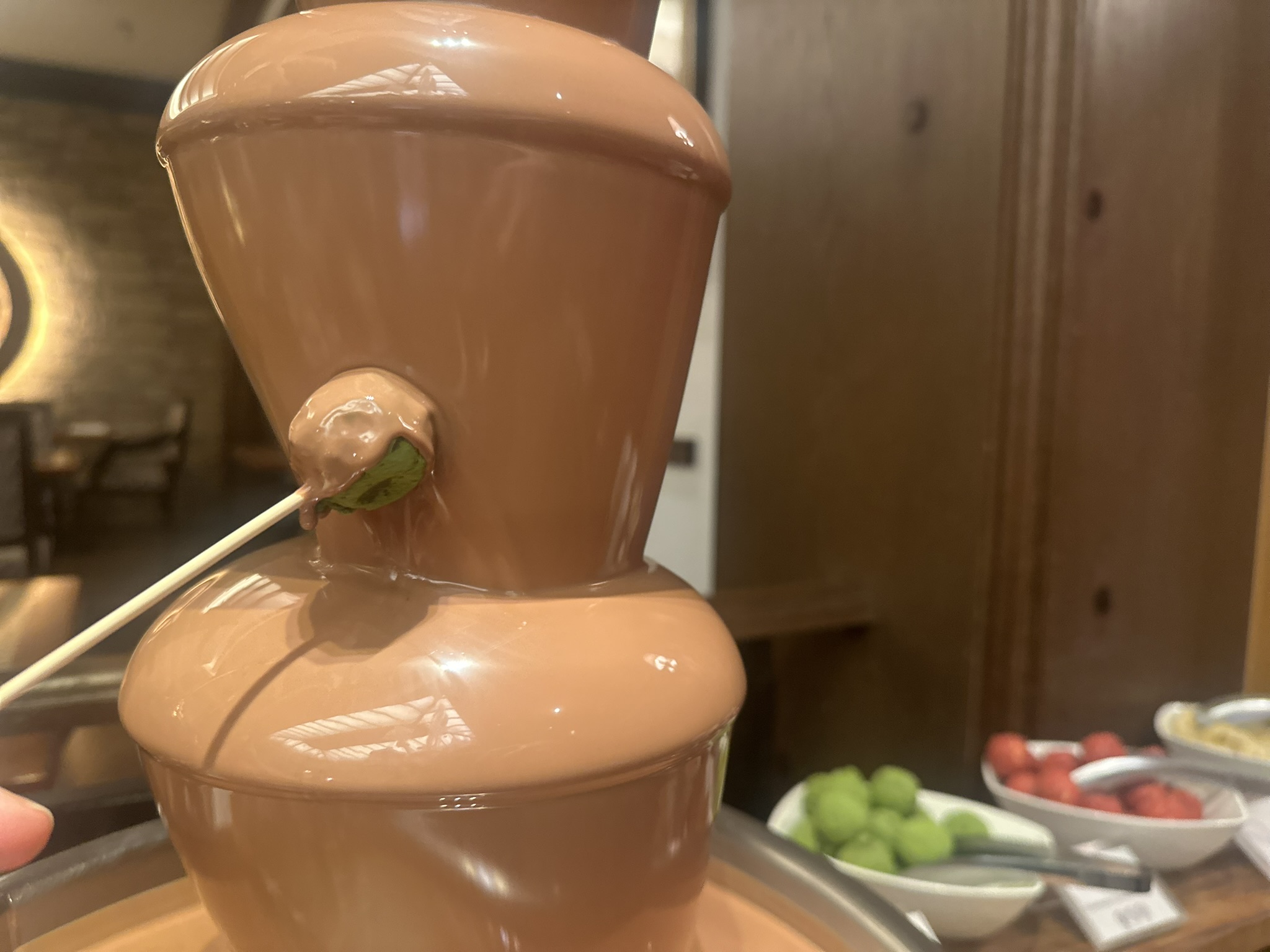 ミルクチョコレートのファウンテンでは、マシュマロやマドレーヌなどをディップ。