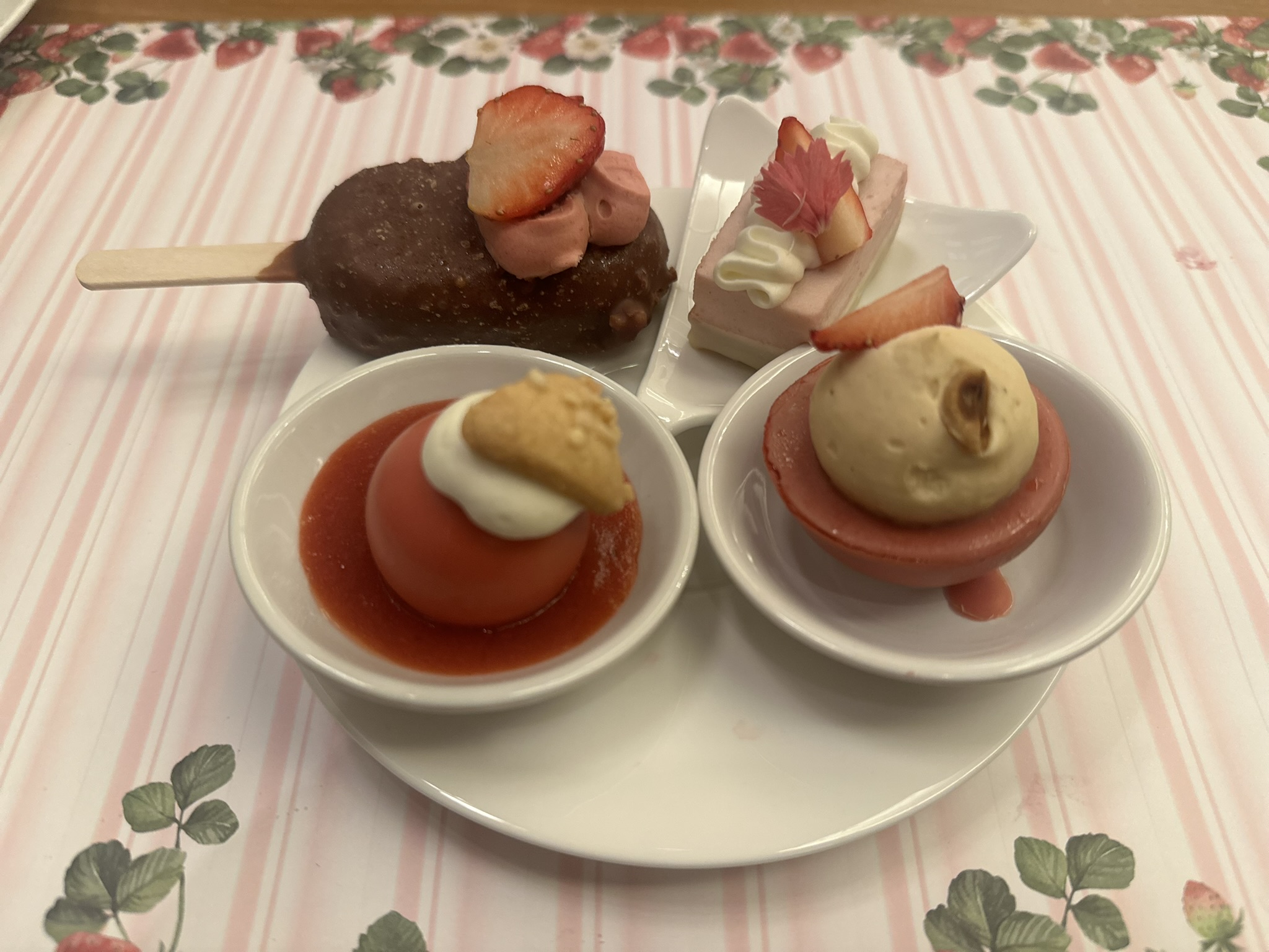 そのほか、ジャンドゥーヤチョコレートとブラックベリーティーシャンティー、いちごティラミス、ストロベリーオペラ、チーズケーキムース オレンジゼリーといちご、いちご大福など、小ぶりながら個性のあるスイーツが揃い、最後まで飽きることなく楽しめます。