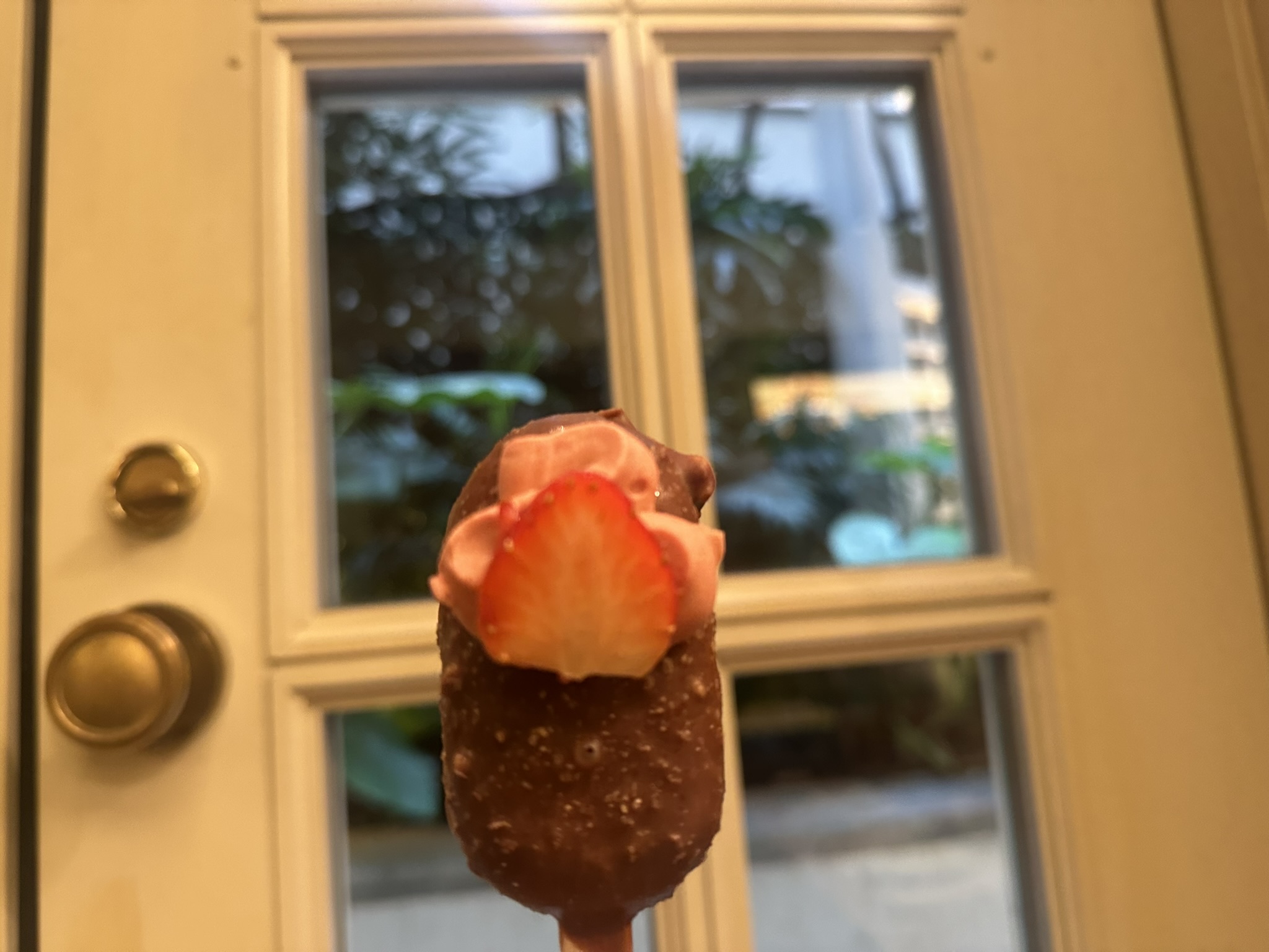 ライブステーションでは、温かいチョコレートケーキに冷たいバニラアイスと苺を添えた一皿を提供。温冷のコントラストと濃厚なチョコの味わいが印象的です。