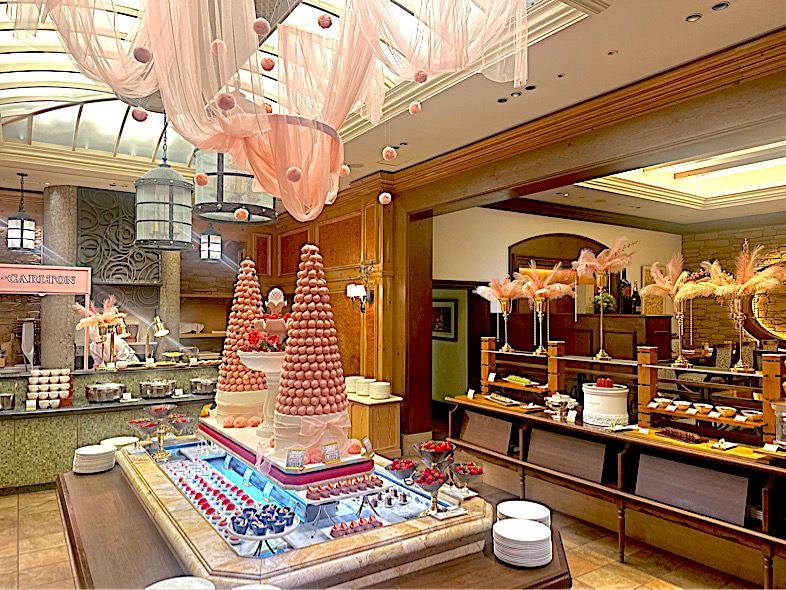 会場となる1階イタリア料理「スプレンディード」は、トスカーナ地方の別荘を思わせる上質な空間。ピンクを基調に羽根や花をあしらった装飾が施され、ブッフェ開始前から気分が高まります。