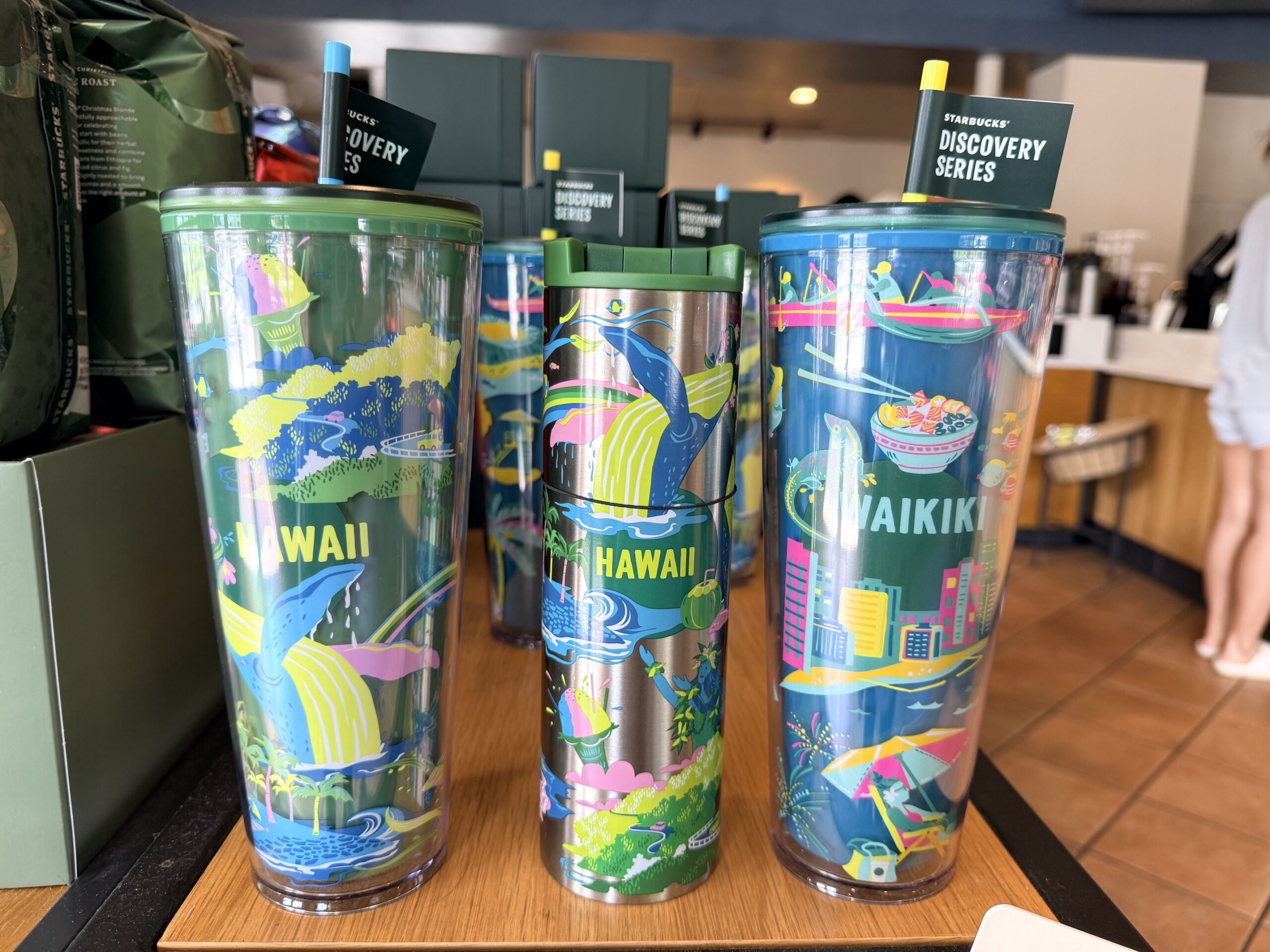 マノア店では、ハワイ限定の新しいデザインのタンブラーを見つけました。ハワイバージョンとワイキキバージョンがありました。各店に数個しかない場合が多いので、見つけたらすぐにゲットするのがいいですよ。