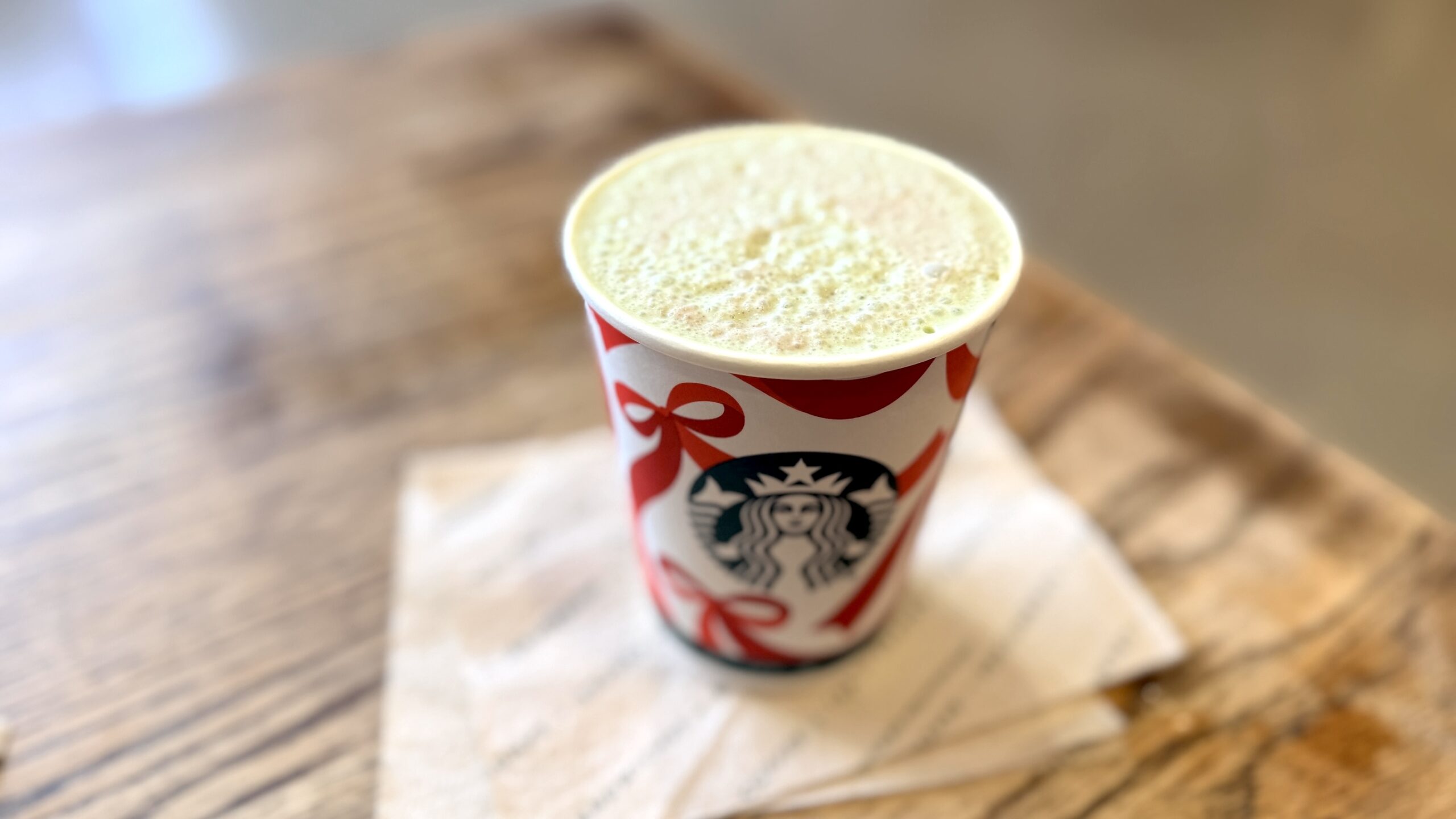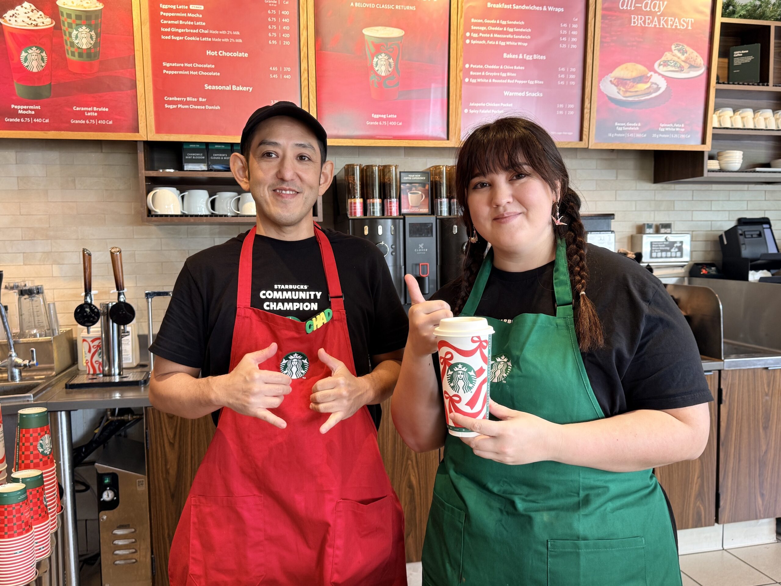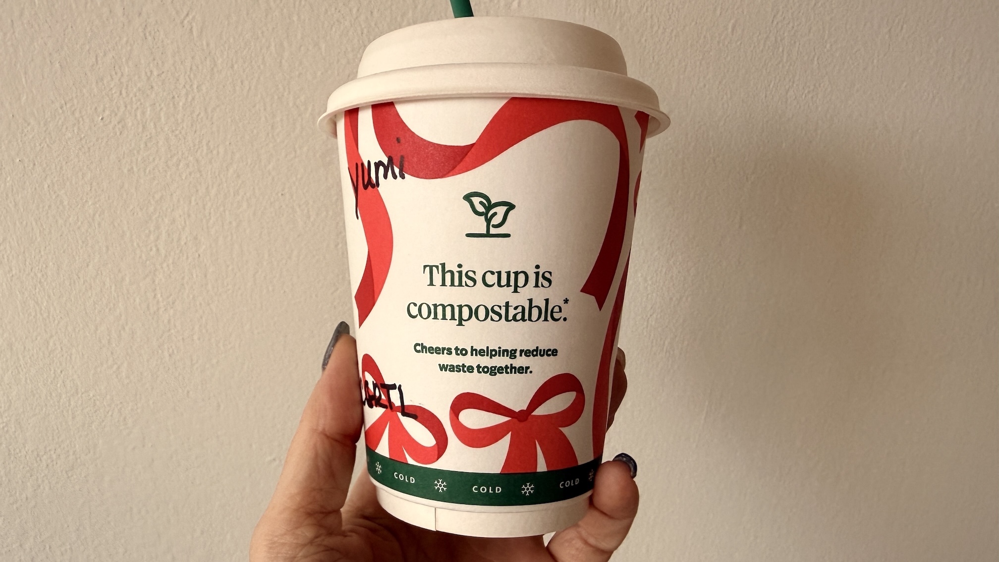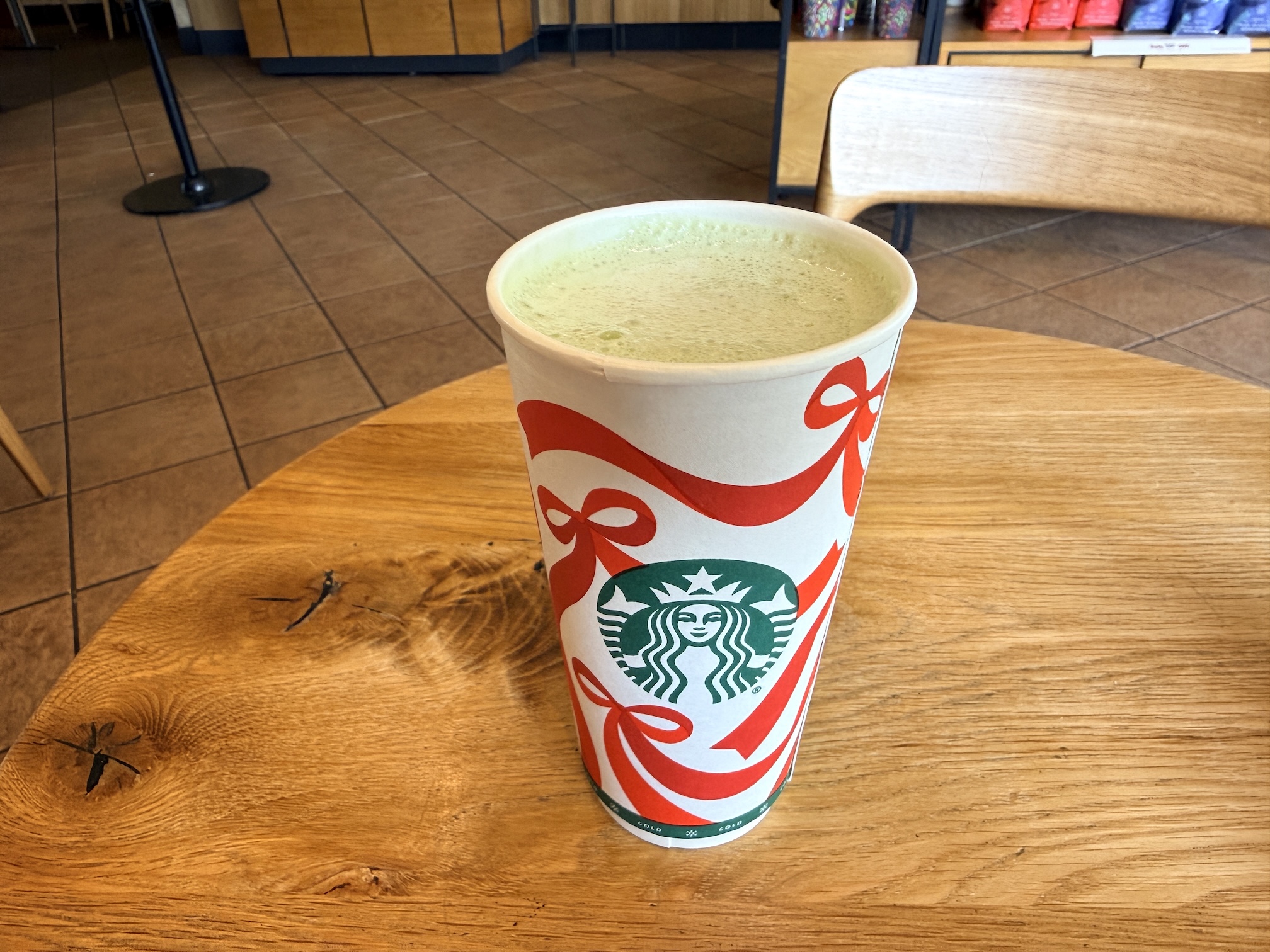 各店には2026年1月初めに訪れたのですが、どの店でも、まだクリスマス仕様の紙コップを使用していました。「どうしてなのかなぁ、早く新しいデザインのコップを使えばいいのに」と思いながら、ふとカップに目をやると