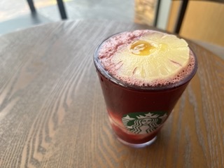 今回はパッションティーにしてみました!なんとパイナップルが上に乗っていて中にもパイナップル果肉が一緒に混ざったフローズンが入っており、混ぜていくとティーと合わさって爽やかな味わい!