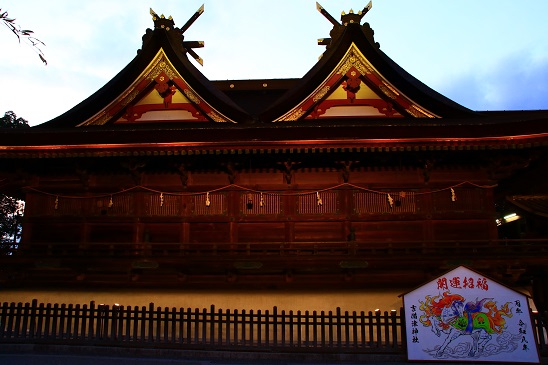 吉備津神社では、お正月の期間に国宝の本殿と拝殿のライトアップが1月15日までありましたので、再び吉備津神社に戻り、日暮れからのライトアップを楽しみます。