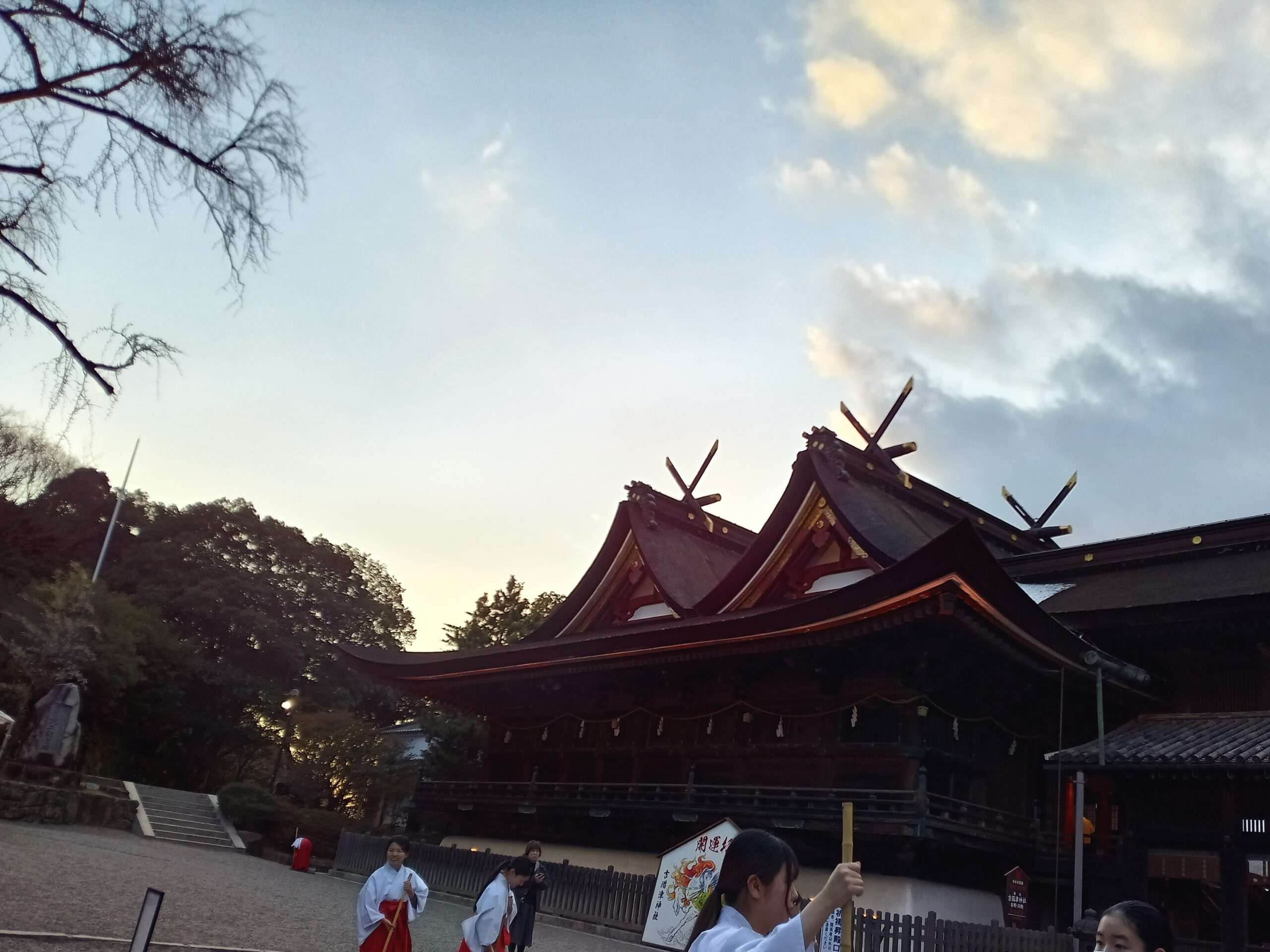 灯りが燈り始めましたが、まだ空は明るい状態です。多くの巫女さんが境内を掃き清められているところでした。