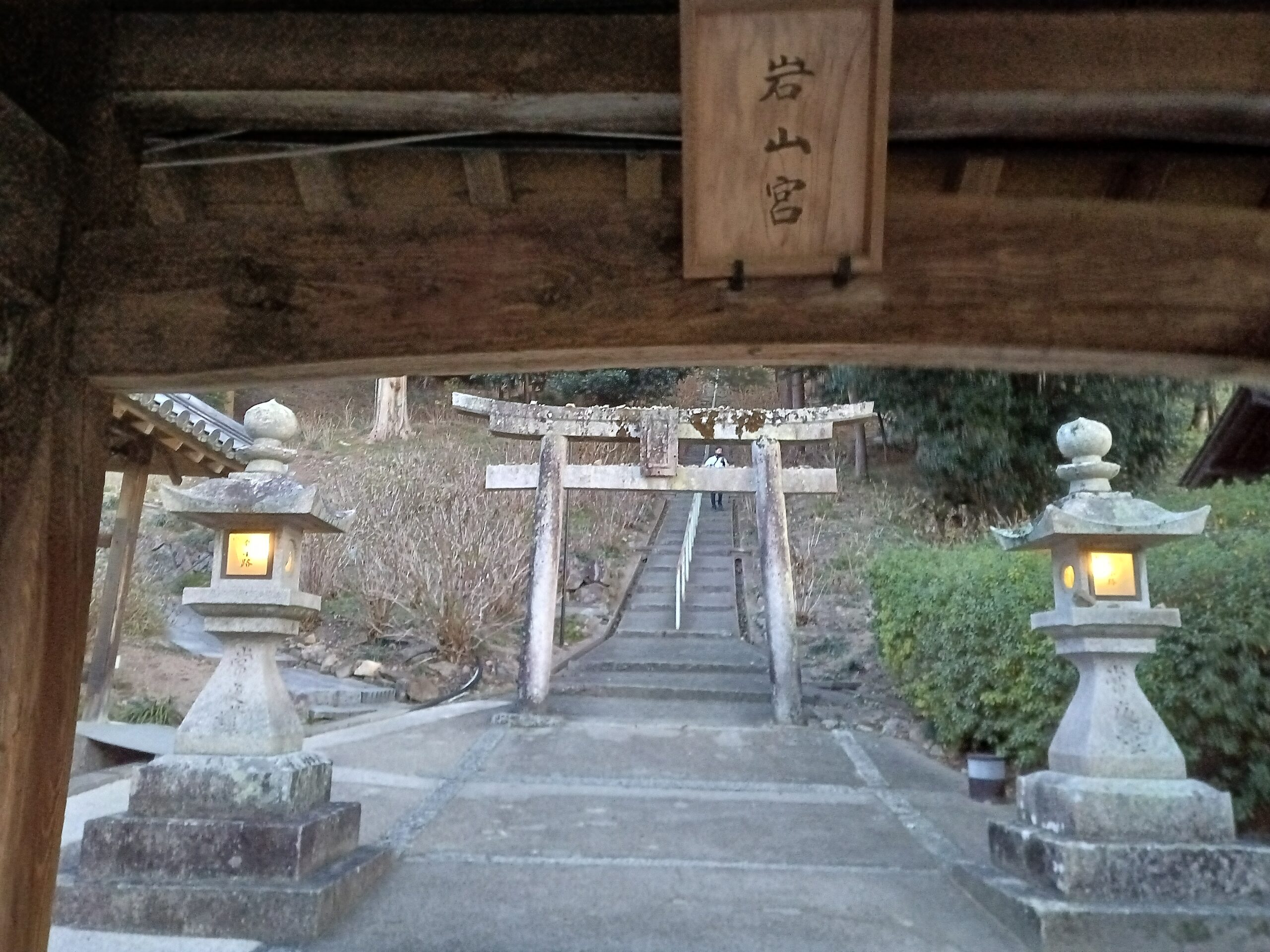長い廻廊を本殿方向へ進むと春日宮、大神宮、八幡宮を祀った三社宮。岩山宮への入り口の行燈に灯りが燈り雰囲気がでてきました。