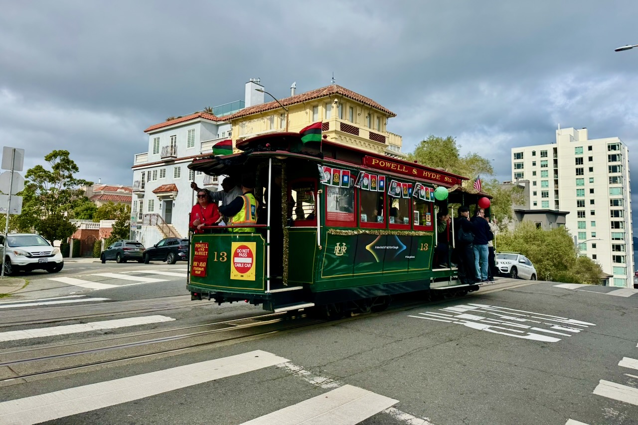 まずは、ケーブルカーの「パウエル・ハイド線」に乗車します。途中からも乗れると何かであったので、今回は実験的に途中乗車の現状はどうなんだろうとノブヒルからケーブルカーを待ってみました。結論から言えば、やはりターミナル(始発)から乗車した方が時間が読める。特に繁忙期はほぼ満員で運行しているので、閑散期ならまだしも、始発の長い行列にはちゃんとした理由があった。