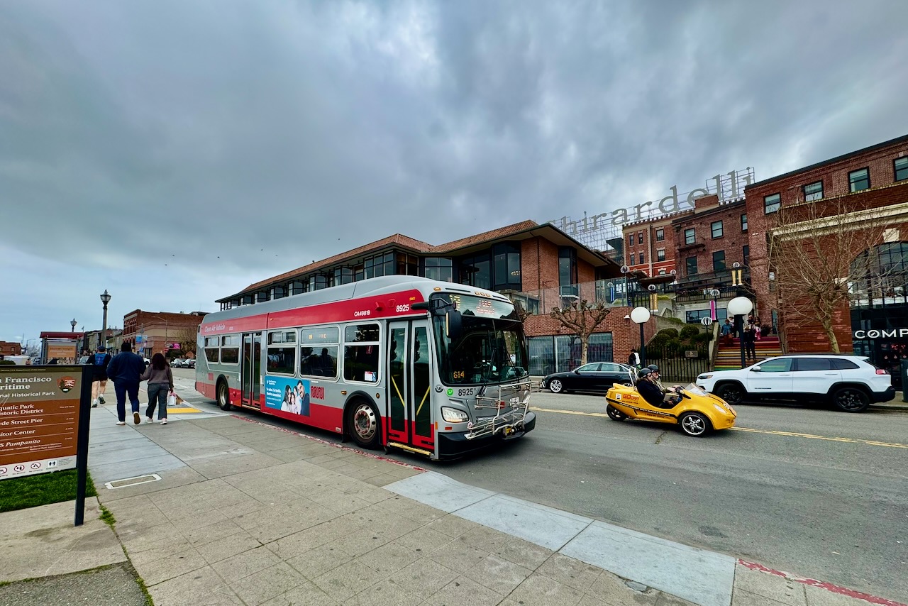 ハイドStを線路沿い下りきった場所にギラデリスクエアがある。ミュニバス19番の始発(Beach St&Polk St)、またはロンバードを下ったところでPolk St & Lombard Stから乗車。