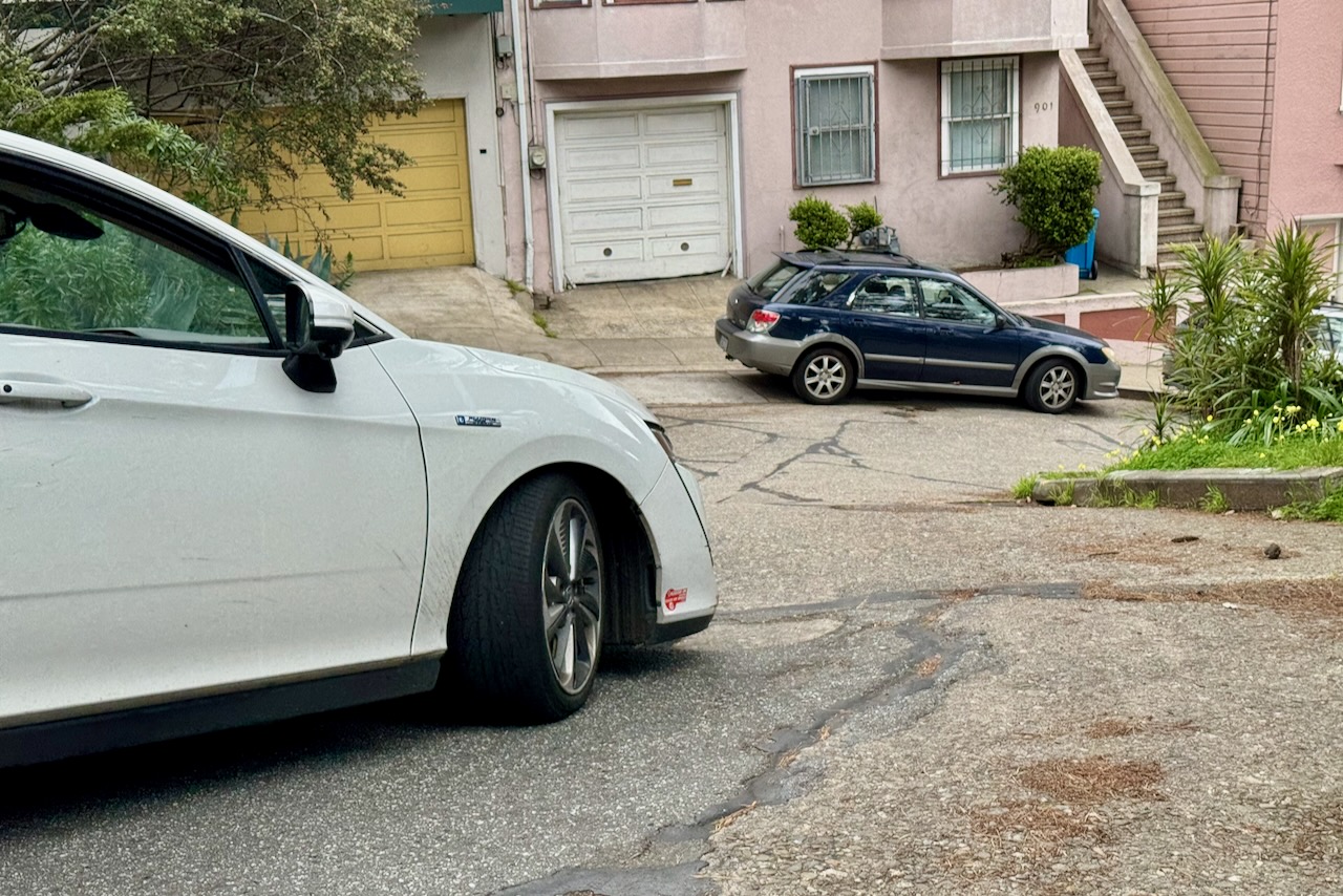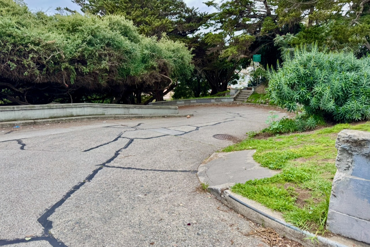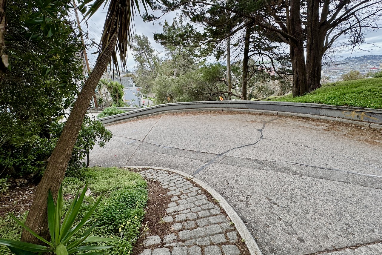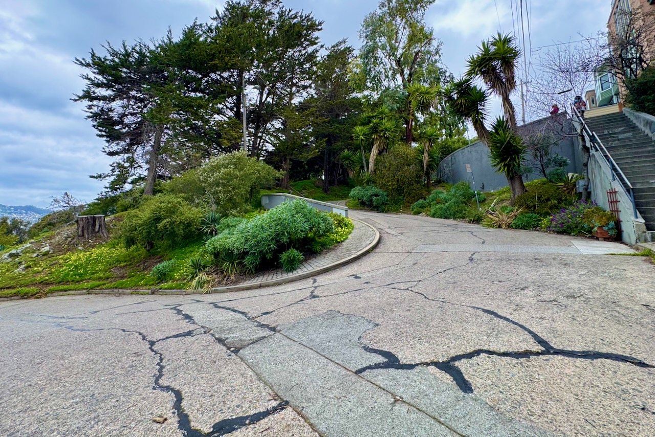 この区間のジグザグ部分の勾配は約14.3%。数字だけ見ればロンバードより緩やかだ。しかし決定的に違うのはカーブの半径。ロンバードが8つのカーブを持つのに対し、バーモントは7つ。数は少ないが、一つひとつの曲がりが鋭角で、半径が小さい。サンフランシスコ公共事業局の測定でも、こちらの方が“より曲がっている”とされる。カーブの先が見えない。内側に傾いた路面。ここは、演出されていない坂、車道なのだ。