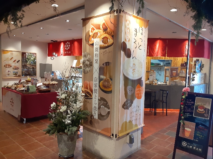 観光客が訪れる率が多い「温泉プラザ山鹿」内にある西日本一の生産を誇る”山鹿和栗”を使った和菓子やドリンクをいただきながら「ホッ」としましょう♪