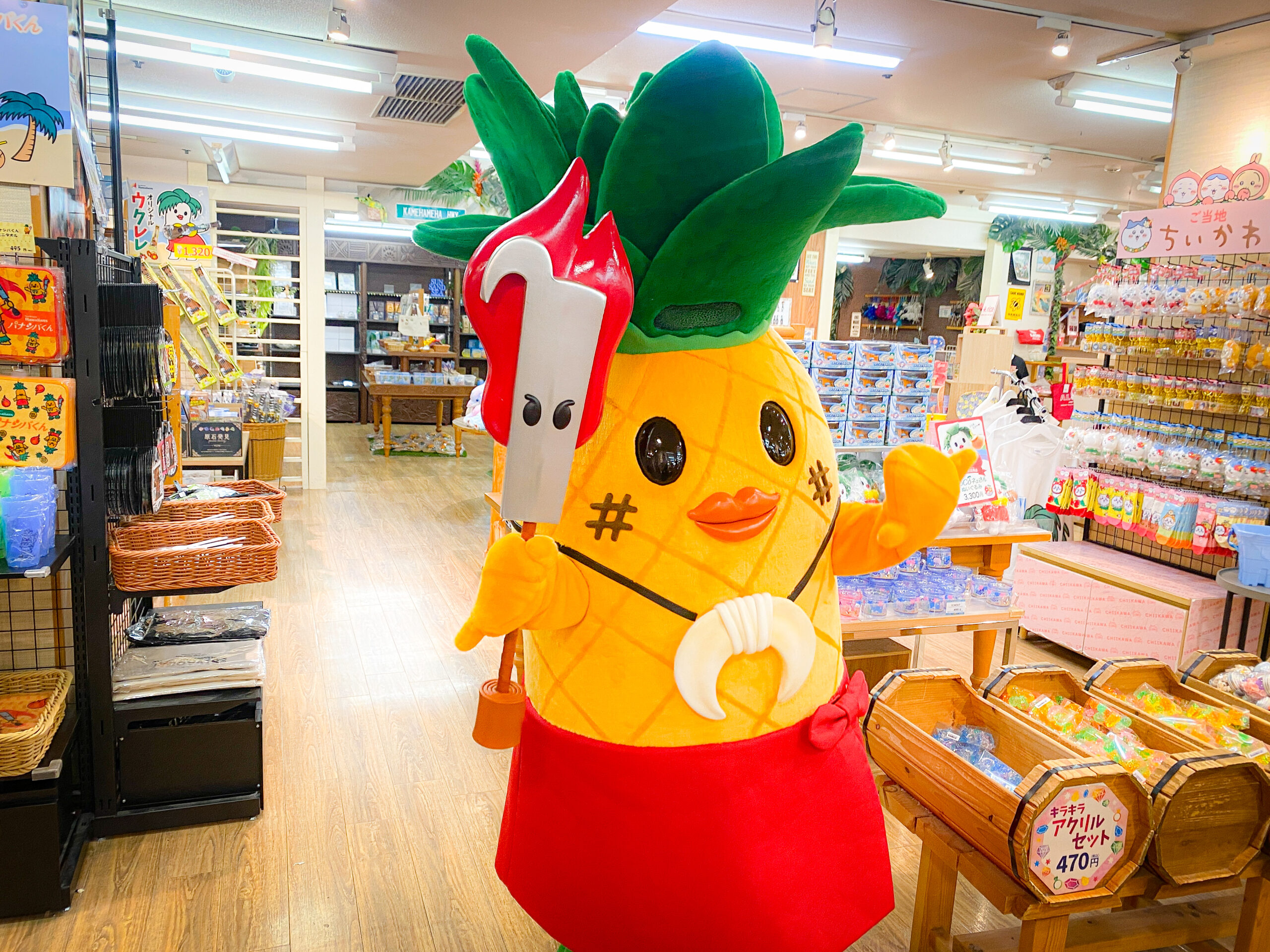 50周年に登場した「CoCo(ココ)ネェさん」に続き、60周年を記念して登場したのが、ハワイ生まれの新キャラクター「パナシバくん」。同郷の「CoCoネェさん」が人気だと聞きつけ、日本に輸入されるパイナップルに紛れ込みハワイアンズに潜入。ファイヤーナイフダンサー「シバオラ」を見て弟子入りを申し込み、日々、館内で特訓に励んでいるパイナップルの妖精です。