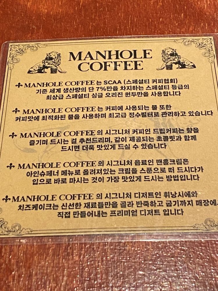 こちらのシグニチャーメニューは4種類の「マンホールクリーム(7000~8000W)」で、上のトッピングされたクリームをスプーンで一口食べた後、下のコーヒーを飲むのがおすすめだそうです。