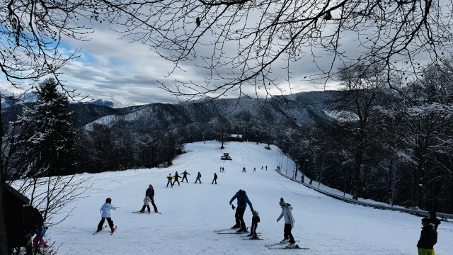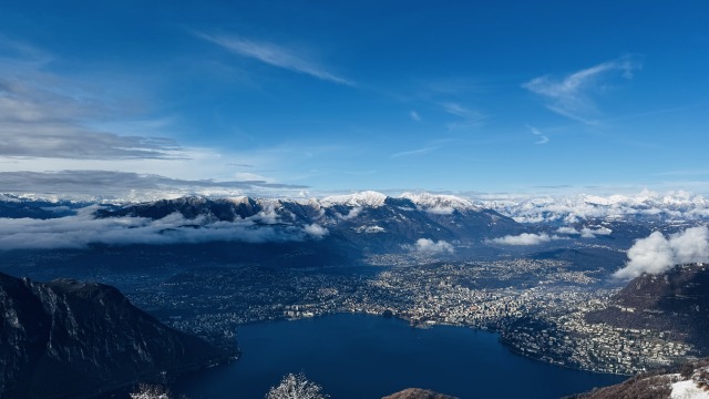 せっかくなので山頂の展望台へ行ってきました。ちょうど太陽も出ていい天気です。目の前に続く山々に雪が覆っていて、夏とは全く違う景色に感動です。雪山とルガーノ湖がとにかく美しい。途中、キッズ用のスキー場もありました。親御さんが一生懸命教えている姿にキュン。