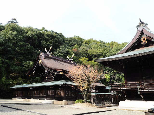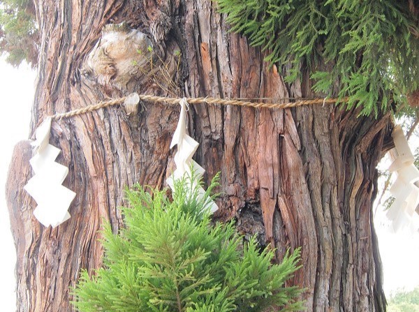 中央の石段を登ると、本殿の左側に樹齢千年以上とされる御神木「平安杉」が聳え立っています。半分、モルタルに覆われた異様な姿ですが、昭和5年の社殿火災の火にあぶられ、半分焼けただれていました。近年、幹の空洞化と老朽化が進行し倒木の恐れもありましたが、平成16年に治療が行なわれ現存しています。