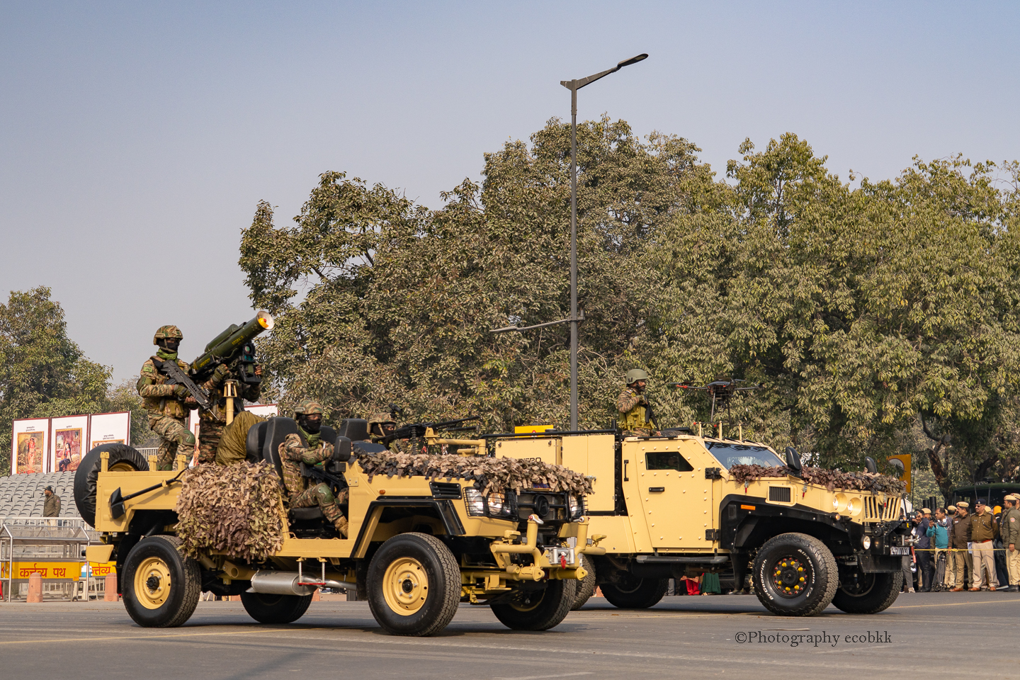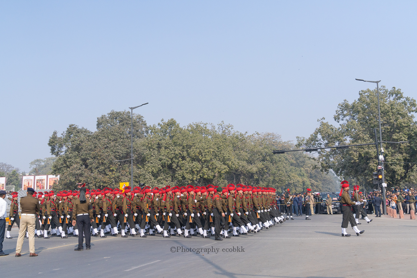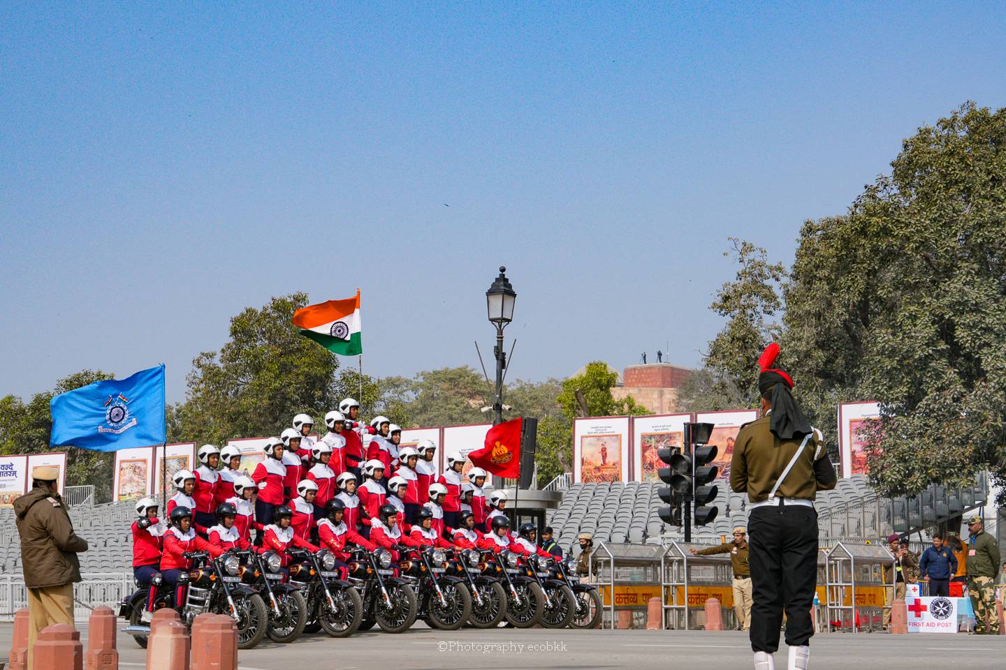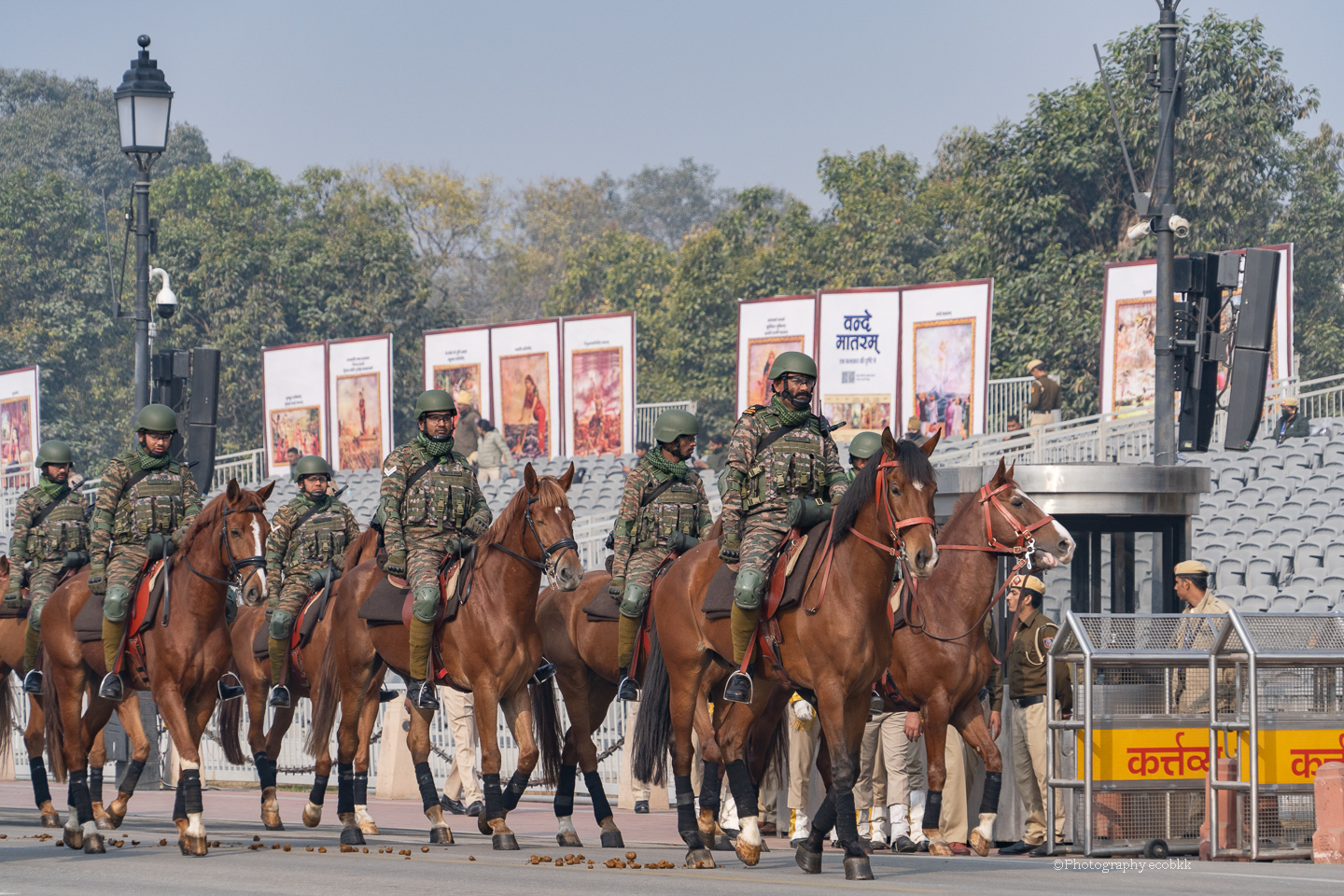 1月21日は、観客席に空席はあったものの、チケットがない私は、チケットを購入したいと話してもチケットは現地ではもう買えないということで、座席エリアには入ることができませんでしたが、インド門近くの通りから、パレードを観賞することはできました。警備員も多く、開始前1時間以上前に現地に到着していたので、なんとか最前列で見学し、写真も撮ることができたように感じます。すぐ近くに、新聞記者の方や軍や行政関係者も多数いました。21日のパレードは本番仕様ではないというでしたが、予行練習でも大変見ごたえがあり、驚きました。