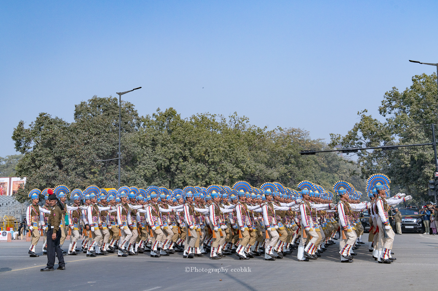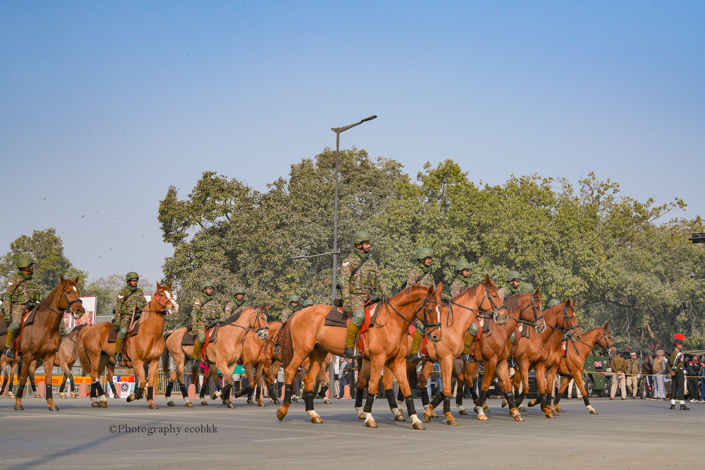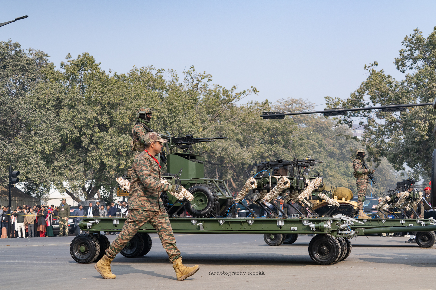 1月21日は、観客席に空席はあったものの、チケットがない私は、チケットを購入したいと話してもチケットは現地ではもう買えないということで、座席エリアには入ることができませんでしたが、インド門近くの通りから、パレードを観賞することはできました。警備員も多く、開始前1時間以上前に現地に到着していたので、なんとか最前列で見学し、写真も撮ることができたように感じます。すぐ近くに、新聞記者の方や軍や行政関係者も多数いました。21日のパレードは本番仕様ではないというでしたが、予行練習でも大変見ごたえがあり、驚きました。