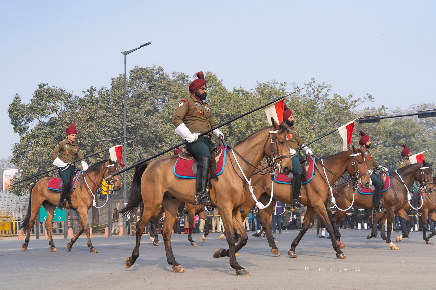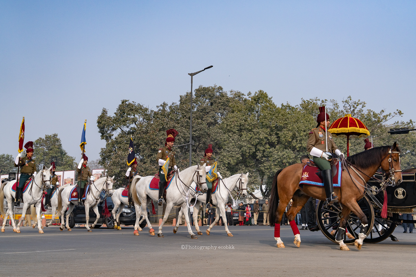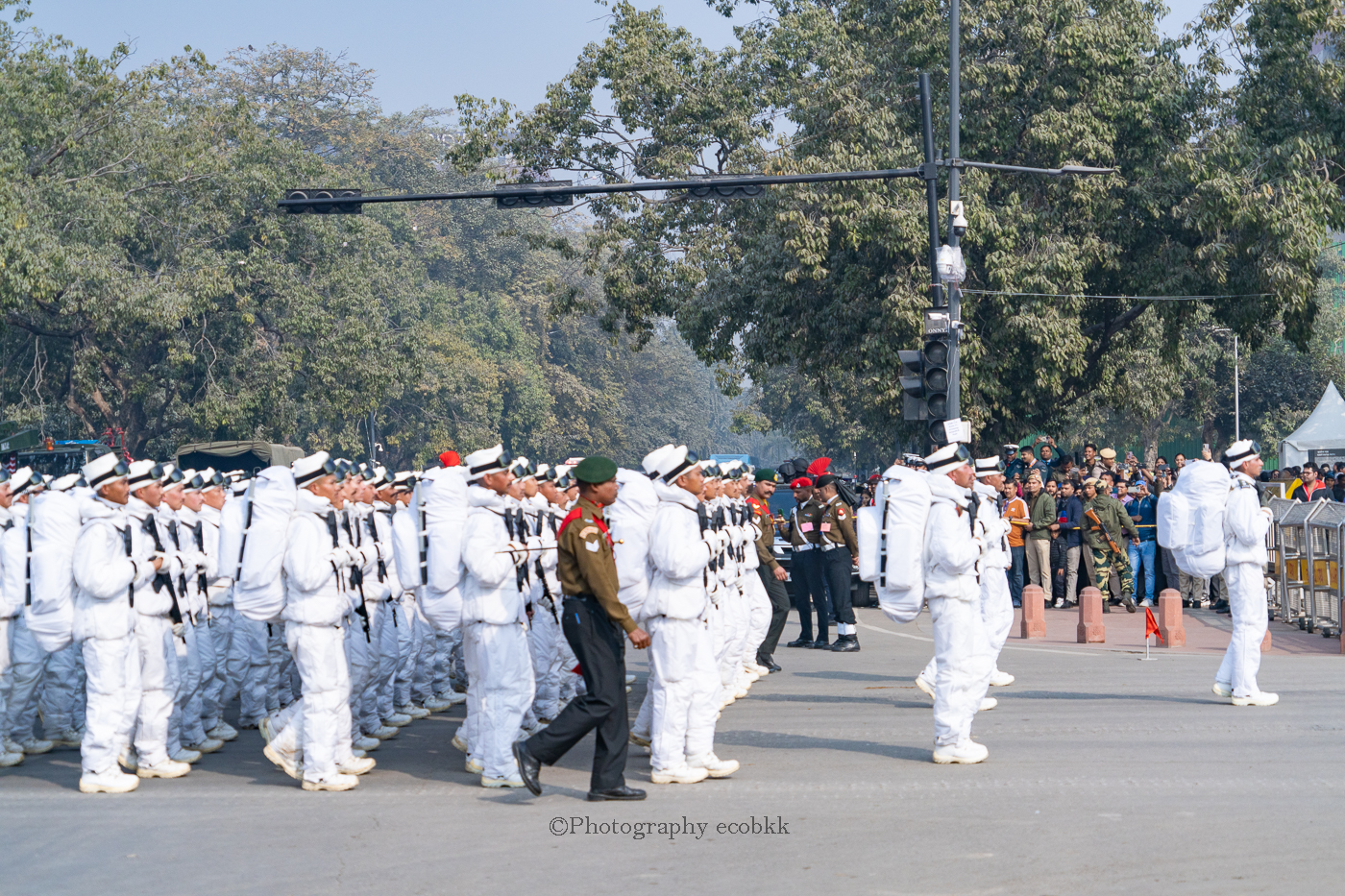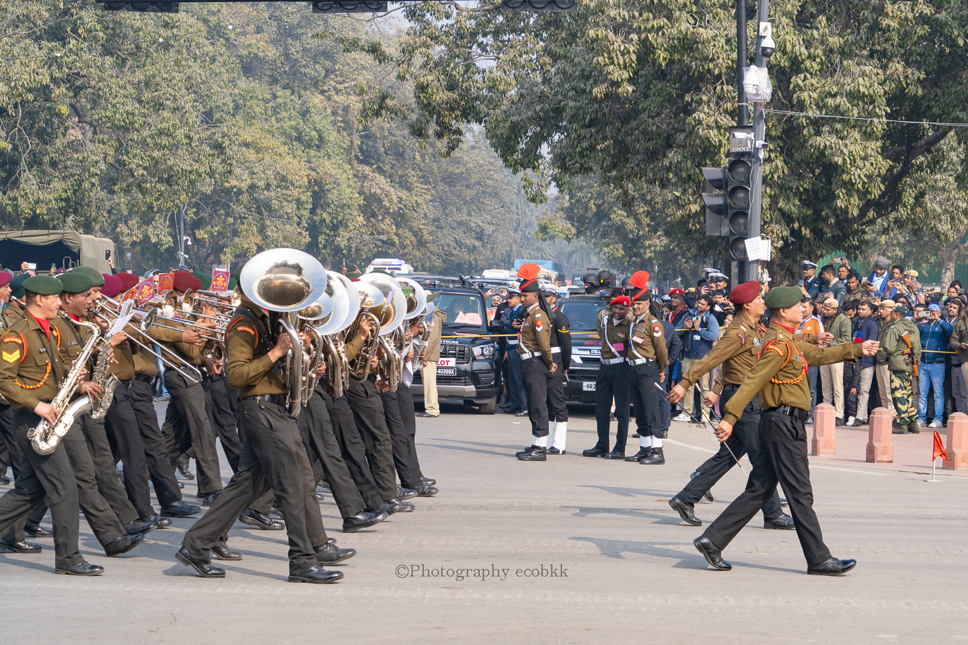 1月21日は、観客席に空席はあったものの、チケットがない私は、チケットを購入したいと話してもチケットは現地ではもう買えないということで、座席エリアには入ることができませんでしたが、インド門近くの通りから、パレードを観賞することはできました。警備員も多く、開始前1時間以上前に現地に到着していたので、なんとか最前列で見学し、写真も撮ることができたように感じます。すぐ近くに、新聞記者の方や軍や行政関係者も多数いました。21日のパレードは本番仕様ではないというでしたが、予行練習でも大変見ごたえがあり、驚きました。