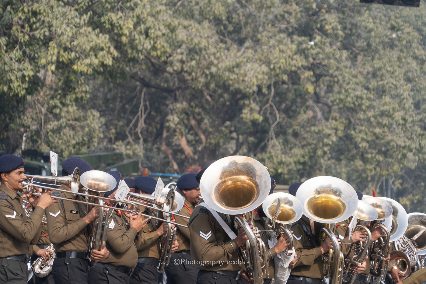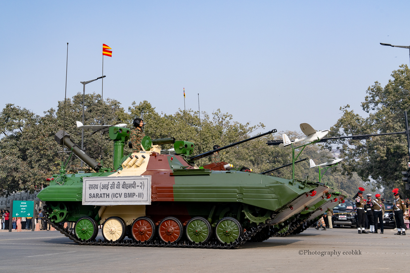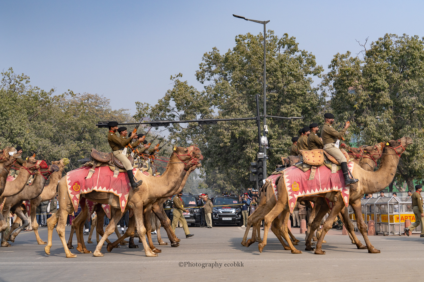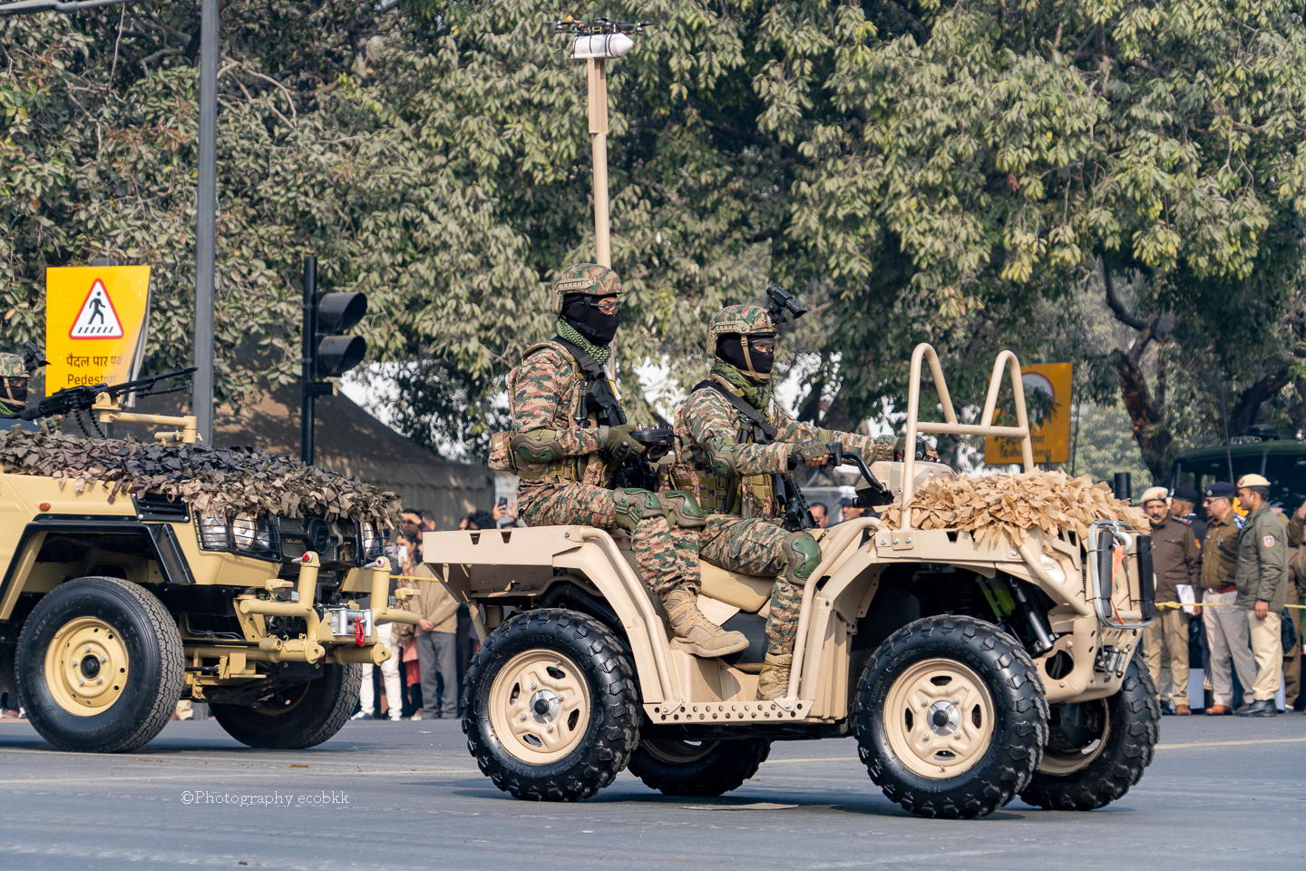 上記の写真は、1月21日の規制がまだ緩やかだった通常のパレード練習の様子をデジタルカメラで撮影したものです。最初は数台の車がやってきて、続いて、動物や車やバイク、戦闘機に乗った人や楽器を演奏する人が登場します。各分野や各地のショー、航空ショーまでありました。動きが美しくそろったインドの軍隊、インドのテクノロジーや各地の民族芸能等観賞できる圧巻のパレードでした。