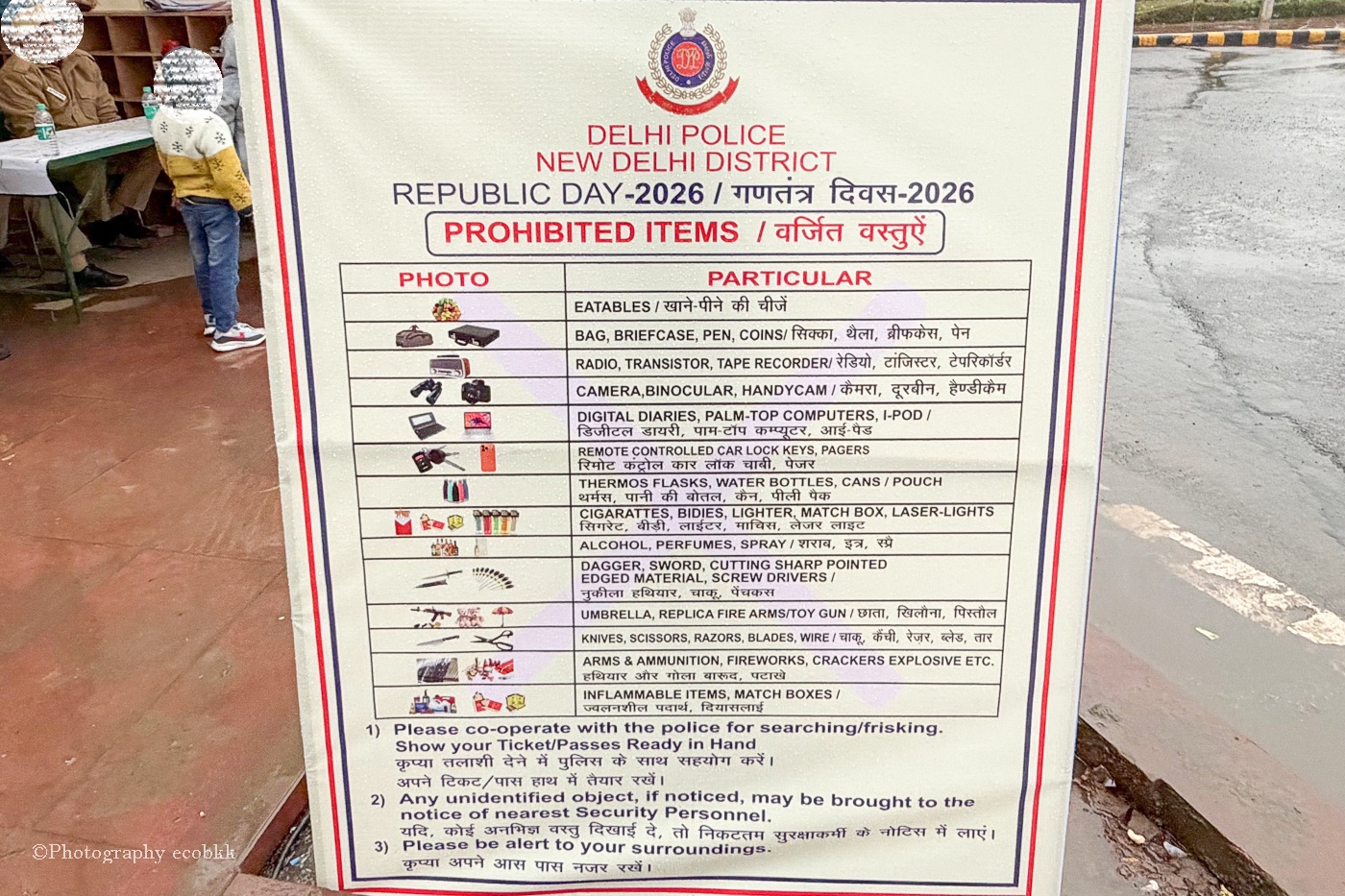 本番仕様の予行練習が行われた日(1月23日)は、セキュリティーが厳しく、チケットがなければ、観客席もパレードも見えない状態でした。たまたま、現地でチケットを譲ってくれる人がいたので、筆者も、運よく、座席に向かうことができました。ただ、セキュリティーが大変厳しく、座席に到着するまで、セキュリティーゲートを2回か3回通過する必要がありました。カバンやデジタルカメラの持ち込みが禁止で、ゲートに行く前に荷物を預けに行きましたが、1回目のゲートで携帯電話のバッテリーも持ち込み不可と言われ、没収を回避したかったので、荷物預け入れ所に再度走りました。その後のゲートで、財布の中の硬貨も持ち込み不可と言われ、全て没収されました。持ち込み禁止物は看板に記載されていましたが、意外なものも多くて、見落としてしまう事項がありそうです。おそらく小型のカバンも持ち込み禁止で、車の鍵や傘も持ち込み不可とあったので、本番及び本番仕様のパレード観賞時は持ち物にはくれぐれも気を付けなくてはいけないなぁと感じました。この日は大雨だったからか、本番ではなかったからか、折り畳み傘だったからか、傘の持ち込みは不可のはずでしたが、折り畳み傘は持ち込めました。ただ、担当者によっては折り畳み傘も没収される可能性はあるのかもしれません。これだけ厳しい規制があるものの、携帯電話の持ち込みは大丈夫でした。