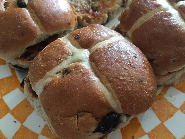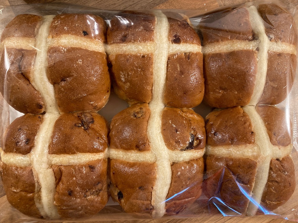 今では年間いつでもパン屋さんやスーパーで買えるものの、やはりイースターが近くなるとホットクロス・バンズが大々的に売り場面積を拡張!レーズンやカランツなどのドライフルーツとスパイスを練り込んだ、優しい味の菓子パンのようなもので、真ん中のバッテンは十字架を表しているそうです。