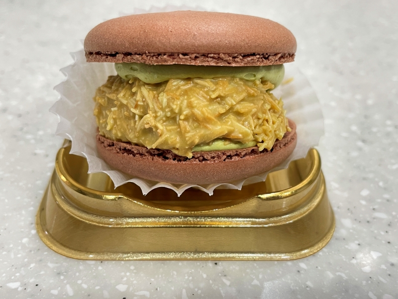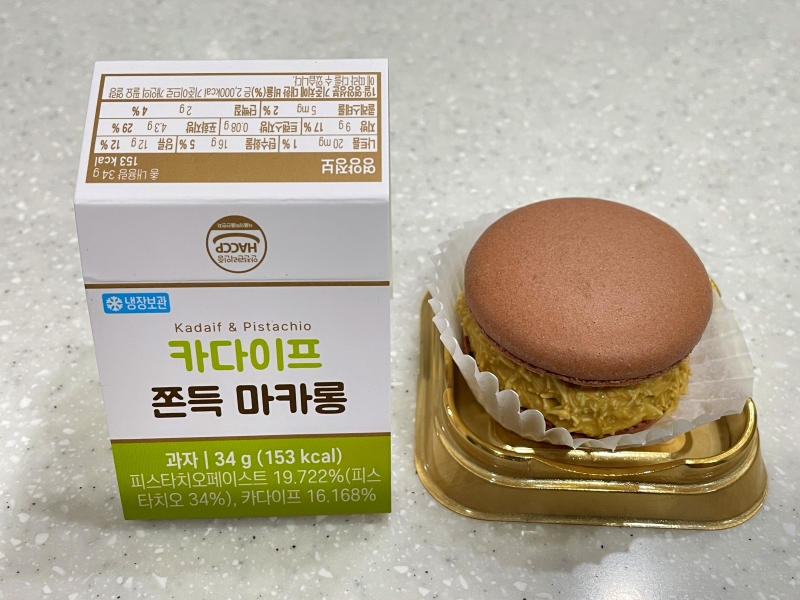 購入したカダイフもちもちマカロン(카다이프 쫀득 마카롱)はドバイチョコ同様、ピスタチオペーストにカダイフが入っているマカロンです。購入価格は3700ウォンです。