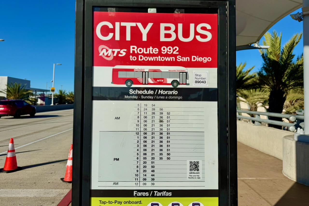 朝9時、サンディエゴ国際空港に到着。空港からホテルまではMTSの992番バスを利用してみました。上の階?下の階?と初めての空港は迷うことが多いのですが、意外とあっさり発見。料金は$2.50、クレジットカードが使えるのが、到着したての旅行者にはありがたく、初日から公共交通機関で動きやすいです。9時半にはホテルに着き、とりあえず荷物だけ預けて身軽になった。