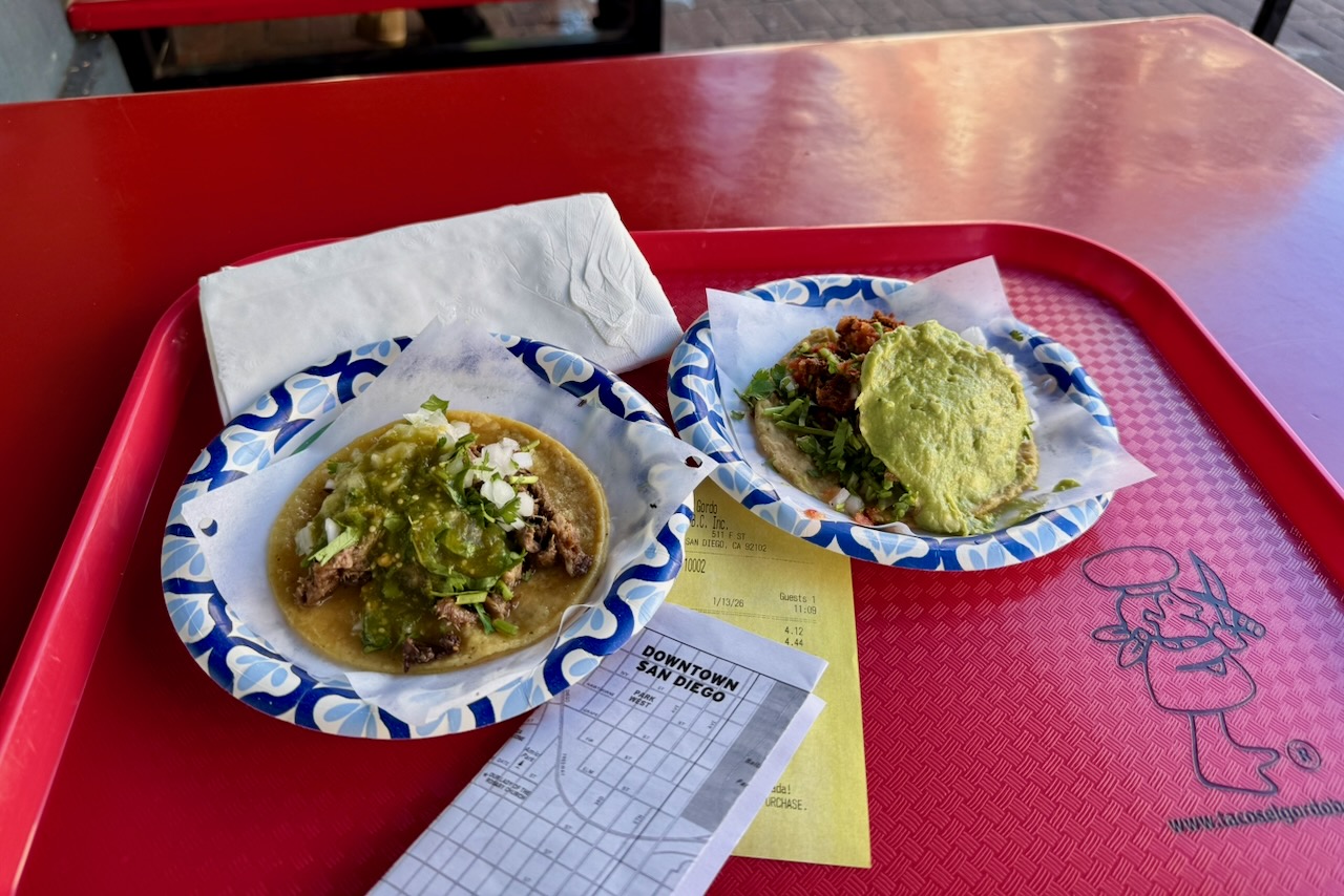 そのままガスランプ・クォーターを散策開始、朝から何も食べていなかったのに気がつき、急にお腹が空いてきまして、サンディエゴ初ランチは、人気のタコス店「タコ・エル・ゴルド」へ。店内は3つのセクションから成り、それぞれ注文し、レジで精算しテーブルに持っていく方式。チョリソーと珍しい牛タンのタコスを外のテーブルでトライ。観光地のど真ん中でも、気取らず食べられるのが、南カリフォルニア・サンディエゴらしい。