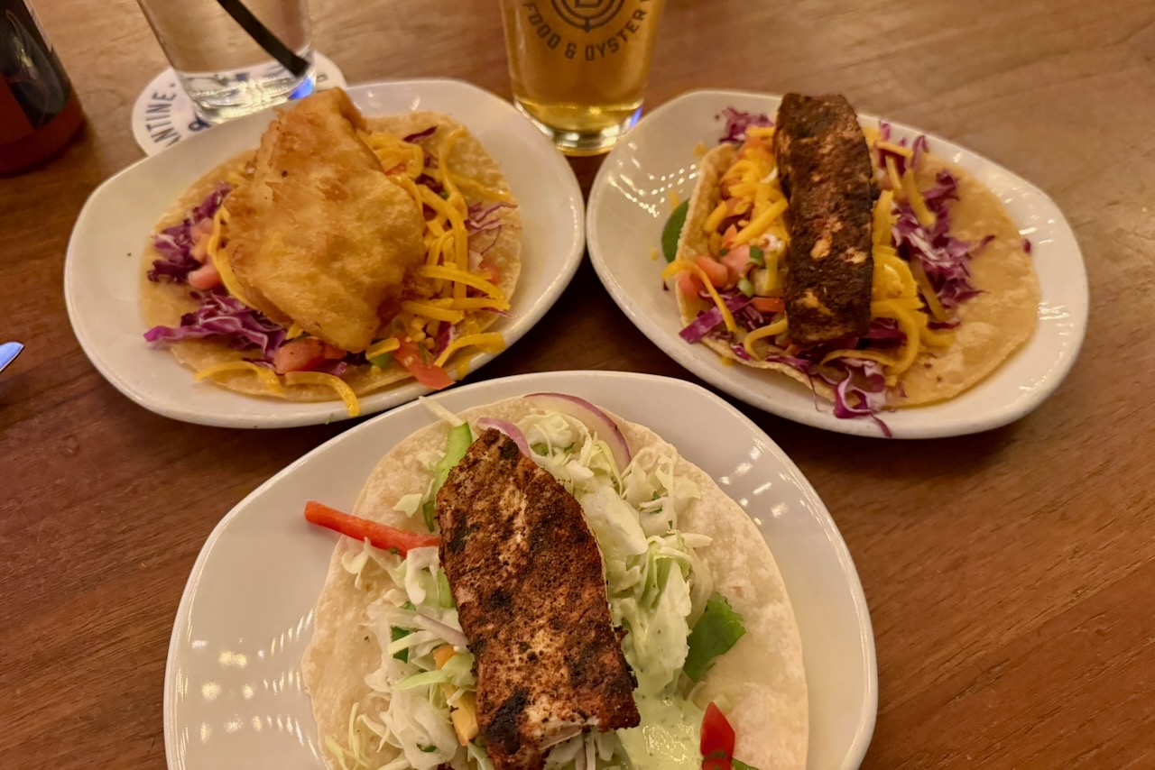くれなずむ空と海の景色は、確かに立ち止まって見る価値がある。それより目の入ったオイスターの文字。2本マストの帆船の意味を持つ「ブリガンティーン・シーフード&オイスターバー」。行かない理由は見当たらない。スタッフがすぐ席を案内してくれました。早速オイスターを頼んだら「東西どっちがいい?」と質問されこちらが面食らってしまいました。西海岸はフレッシュ、東海岸はクリーミーと教えてもらい、その違いを楽しみつつハウスビールの「ケッチ(小さい帆船の意味)」に舌鼓。トロピカル系IPAはオイスターとよく合いました。火曜は“Fat Tuesday”の流れをくむタコチューズデー 。だからこんなに賑わうのか?とにかく普段よりお得なタコスを注文してみた。