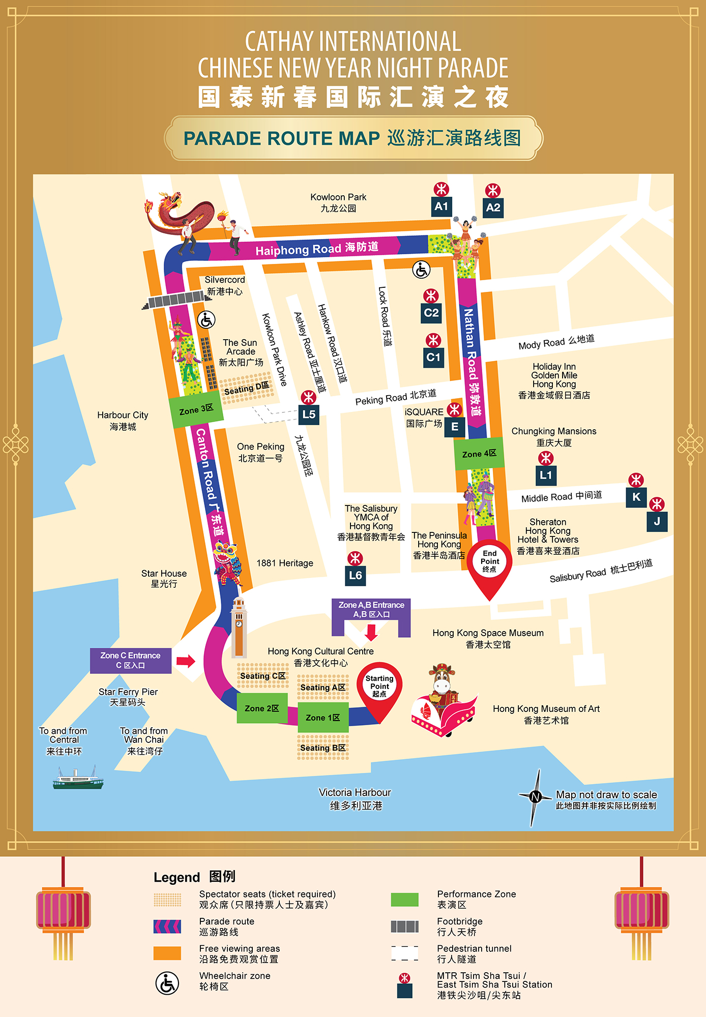 パレードは、例年通り、文化中心(Cultural Centre)を出発し、海港城(Harbour City)を通過して、海防道(Haiphone Raod)を練り歩き、彌敦道(Nathan Road)にあるシェラトン香港ホテル&タワーズがゴールとなります。