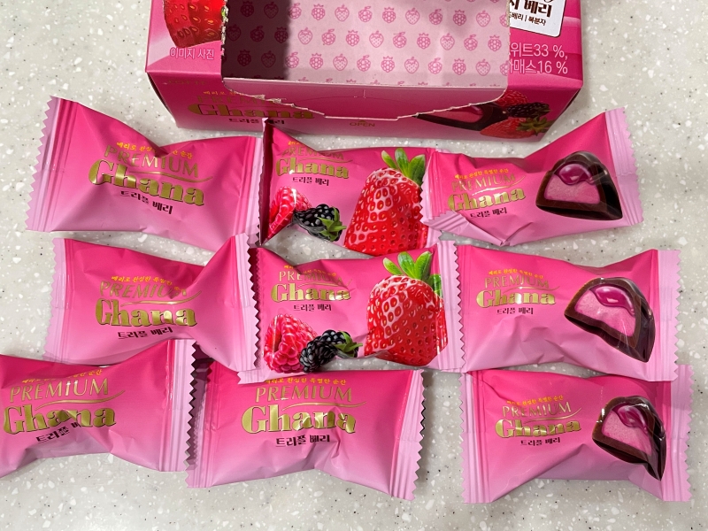 新商品のプレミアムガーナ トリプルベリーを購入し、食べてみました。3種類のベリー(イチゴ、ラズベリー、ポップンジャ)が層になっていて、甘酸っぱさが口の中に広がり、おいしかったです。ポップンジャは韓国産のキイチゴで韓国オリジナルの味なので、こちらもお土産になりそうです。バレンタインデー商品は2月にしか出会えないので、ぜひこの時期に各店舗を覗いてみてはいかがでしょうか。